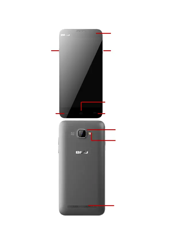 Blu Dash 5.0 - Appearance and Key Function; Device Overview; Button Functions; Camera and Speaker Locations