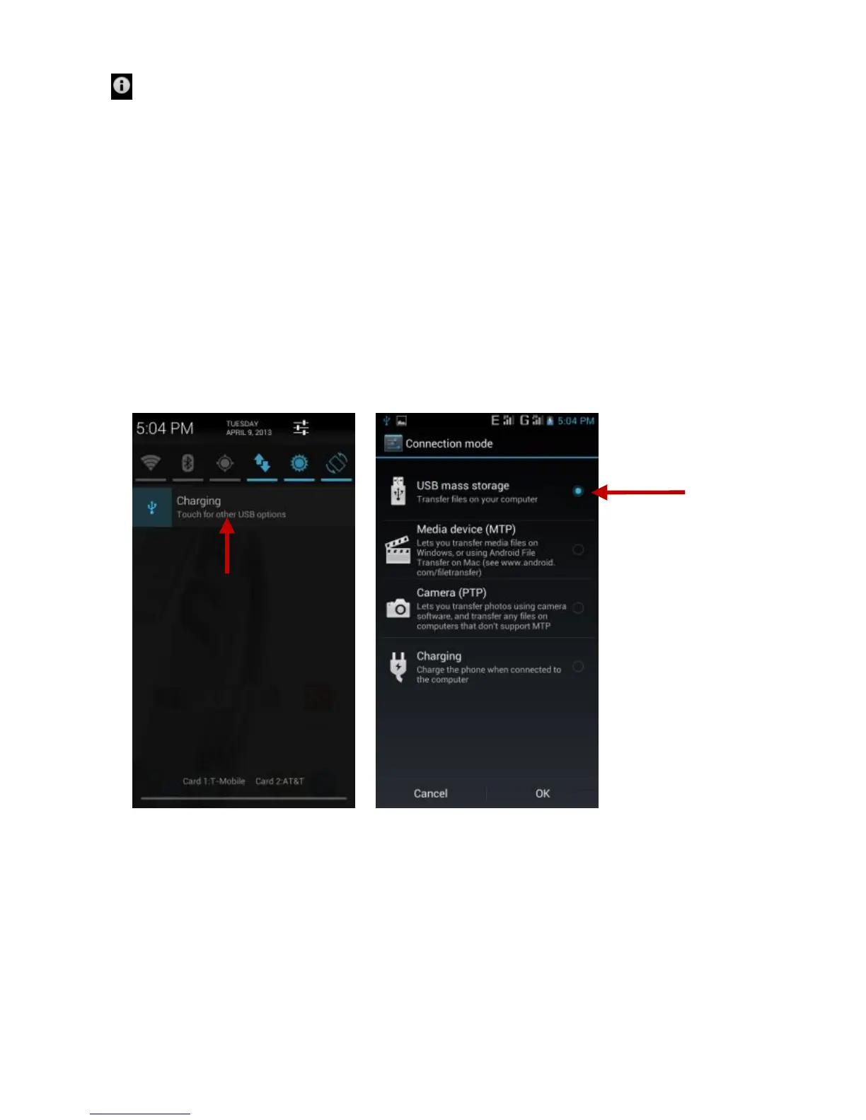 select “USB mass storage” and turn on from the connection screen.
