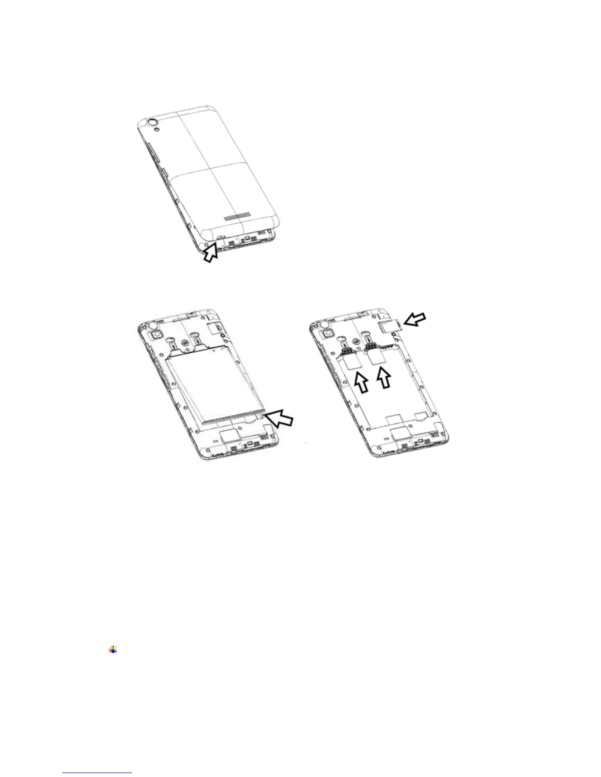 2. Remove the battery and insert the Micro SIM and SD cards to the card slots correctly.