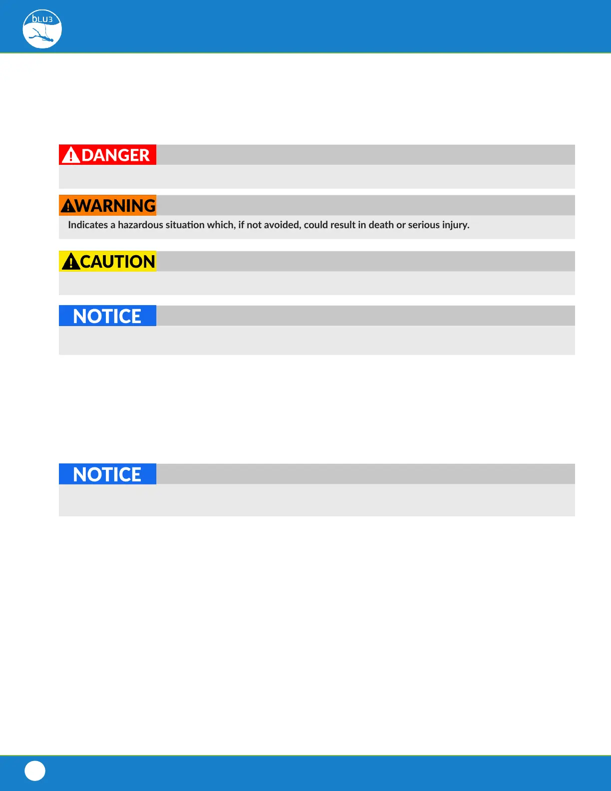 The following symbols will be used throughout the document and on BLU3 products to highlight crical