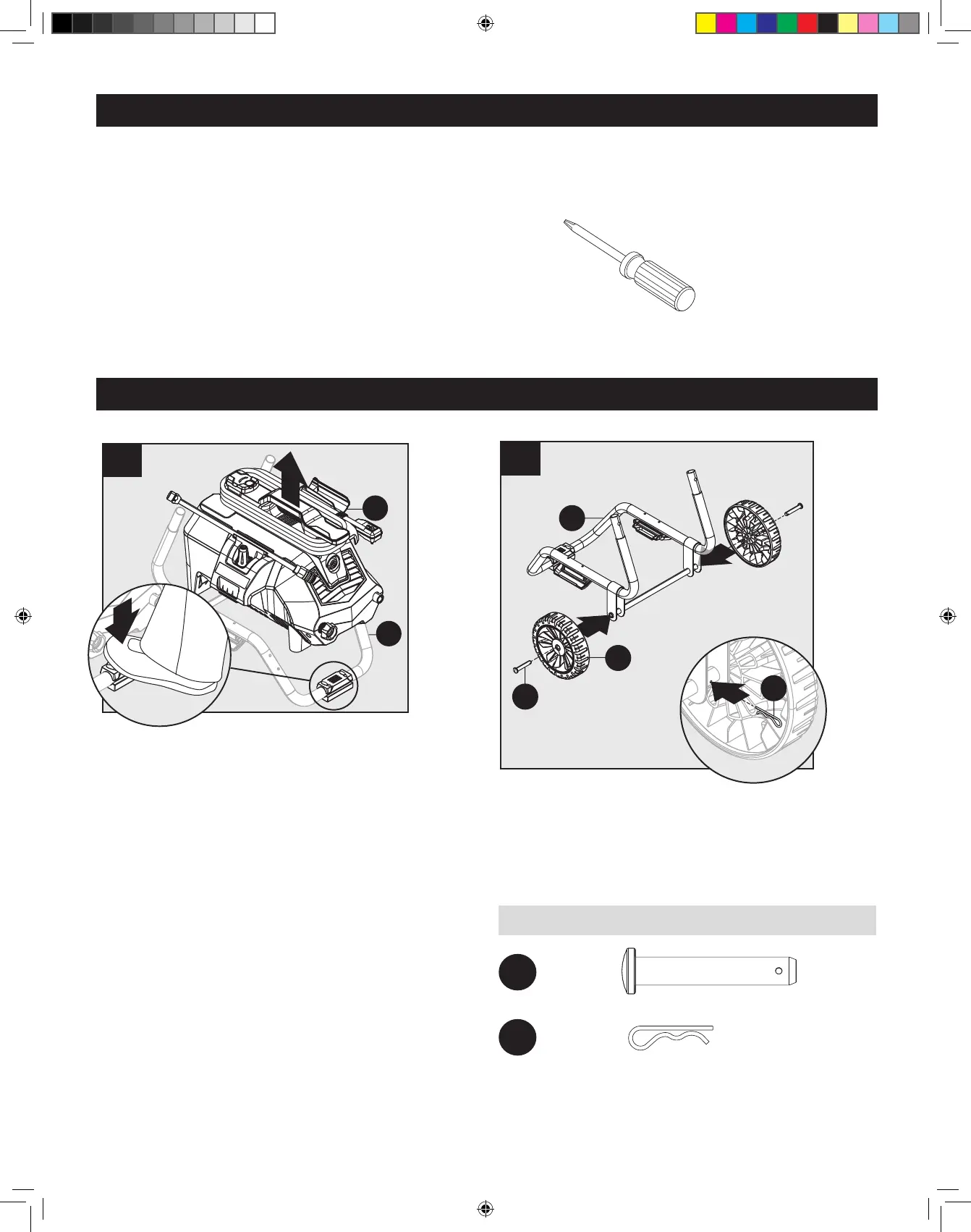 Installez les chevilles d’essieu (AA) et les roues (J)