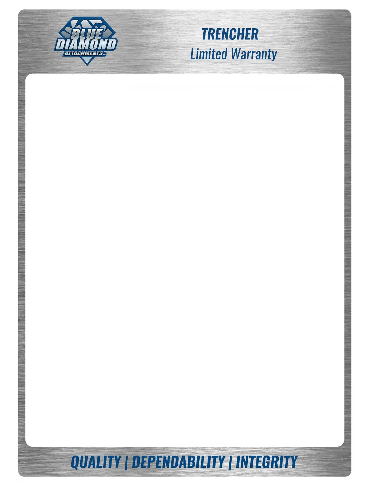 BLUE DIAMOND ATTACHMENTS, a manufacturer of quality attachments, warrants new BLUE