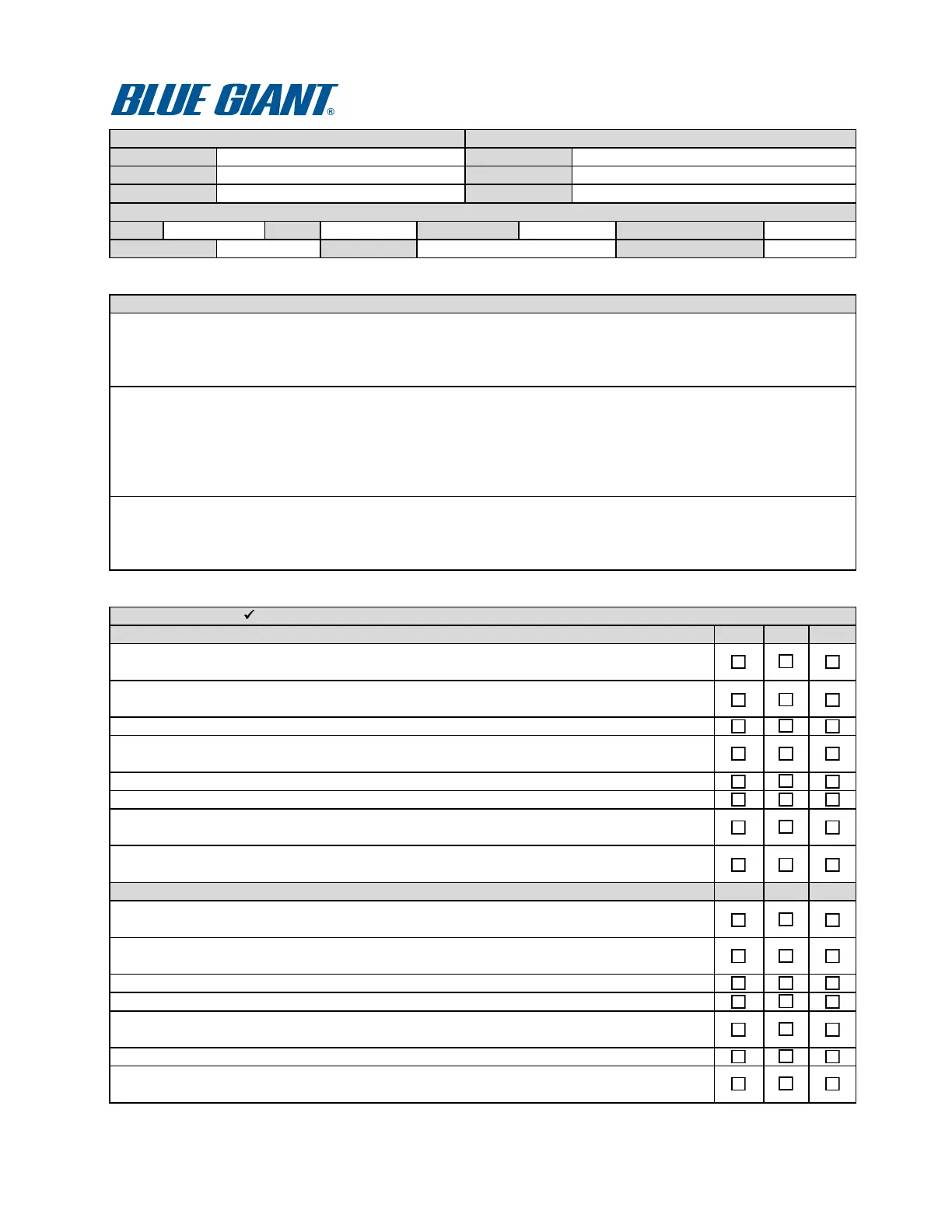 Indicate in the appropriate space as each item has been performed. If the item is found to be not acceptable, describe each