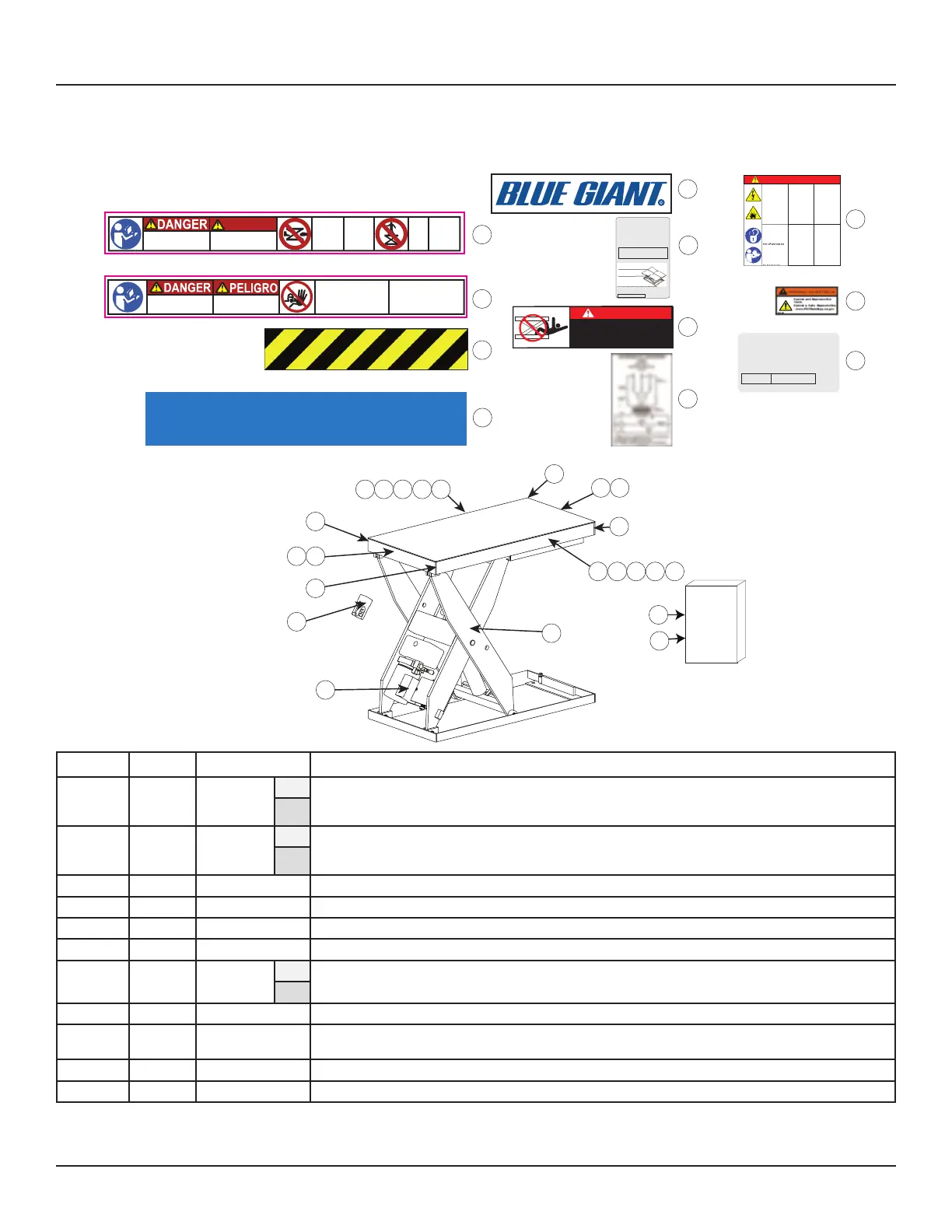 These labels inform operators and personnel about hazardous areas on and around the lift table.