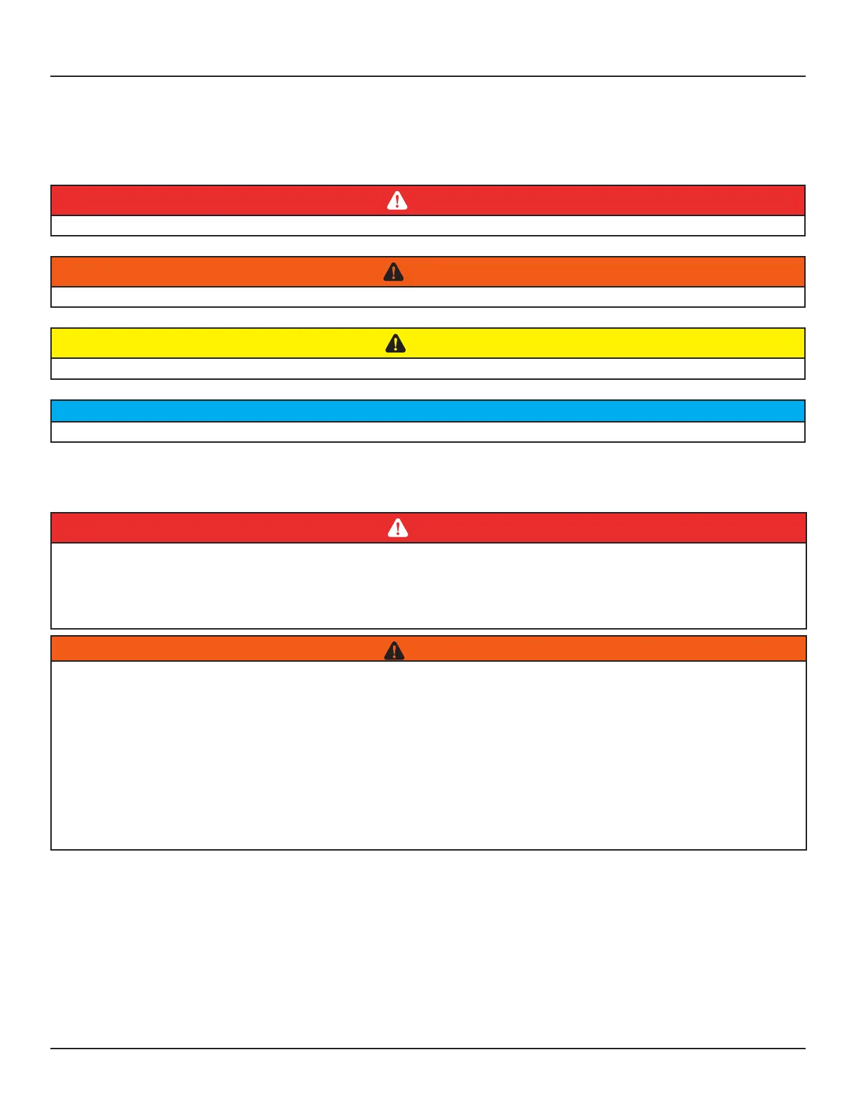 This manual includes color-coded safety messages that clarify instructions and specify areas where potential hazard exists. To reduce