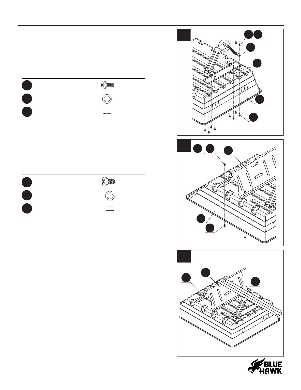1. Attach the tongue support (D) and clamp plate (E)