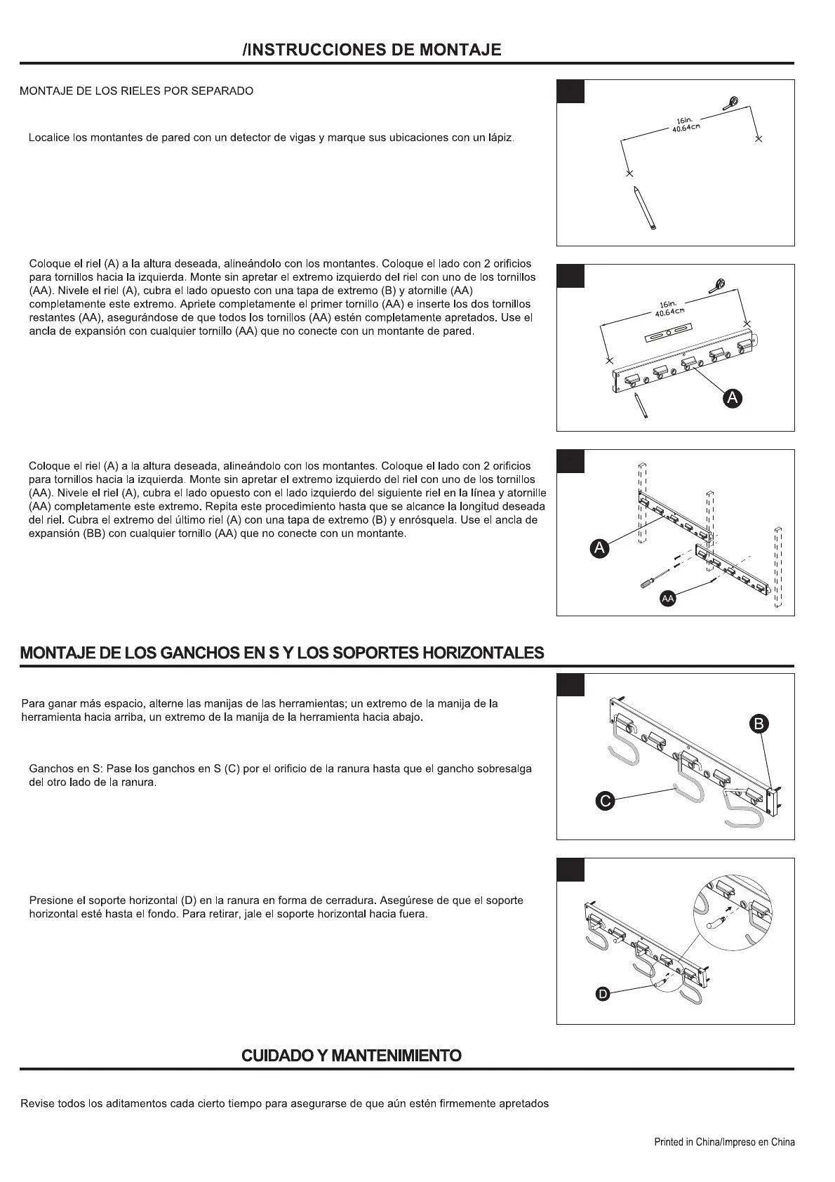 the left. Loosely mount the left end of the rail with one screw (AA). Level the rail (A), cover the