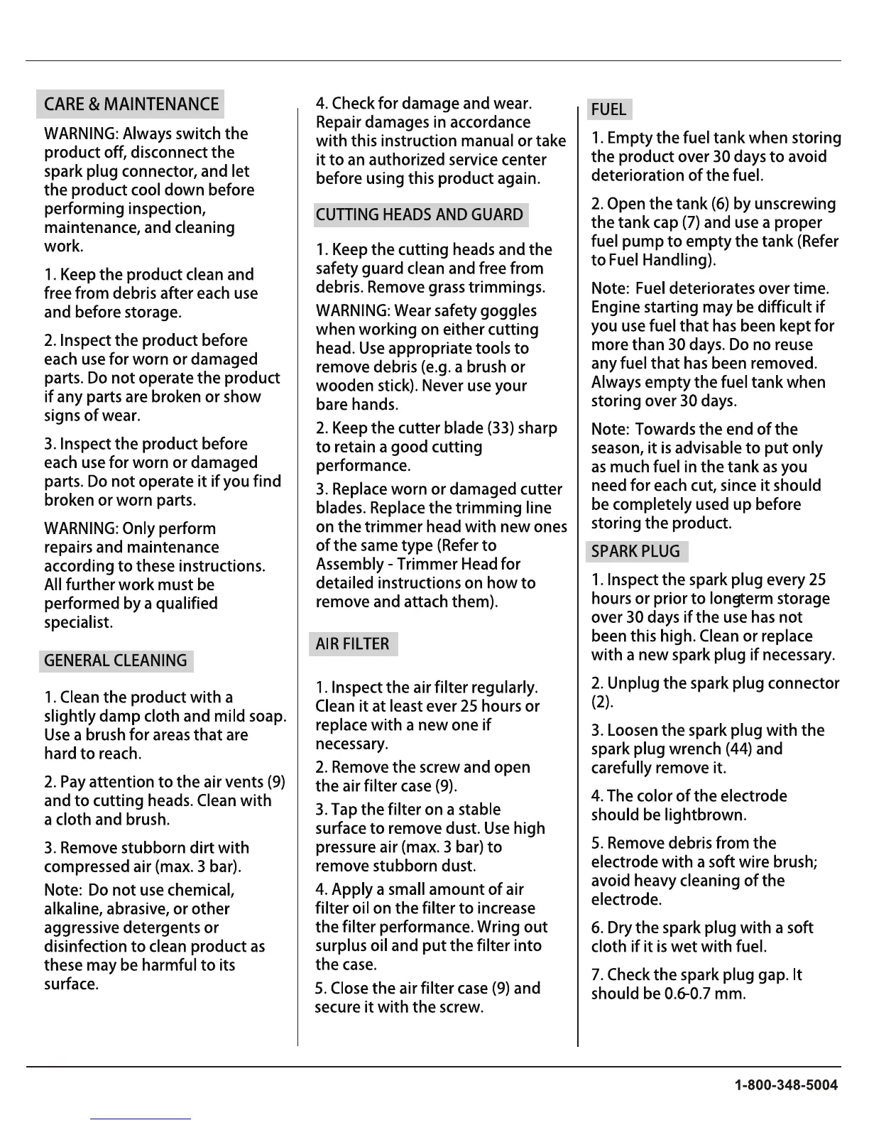 Blue Max 52623 - Product Care and Maintenance; General Cleaning and Air Filter Service; Cutting Head and Spark Plug Maintenance; Fuel Storage and Bevel Gear Check