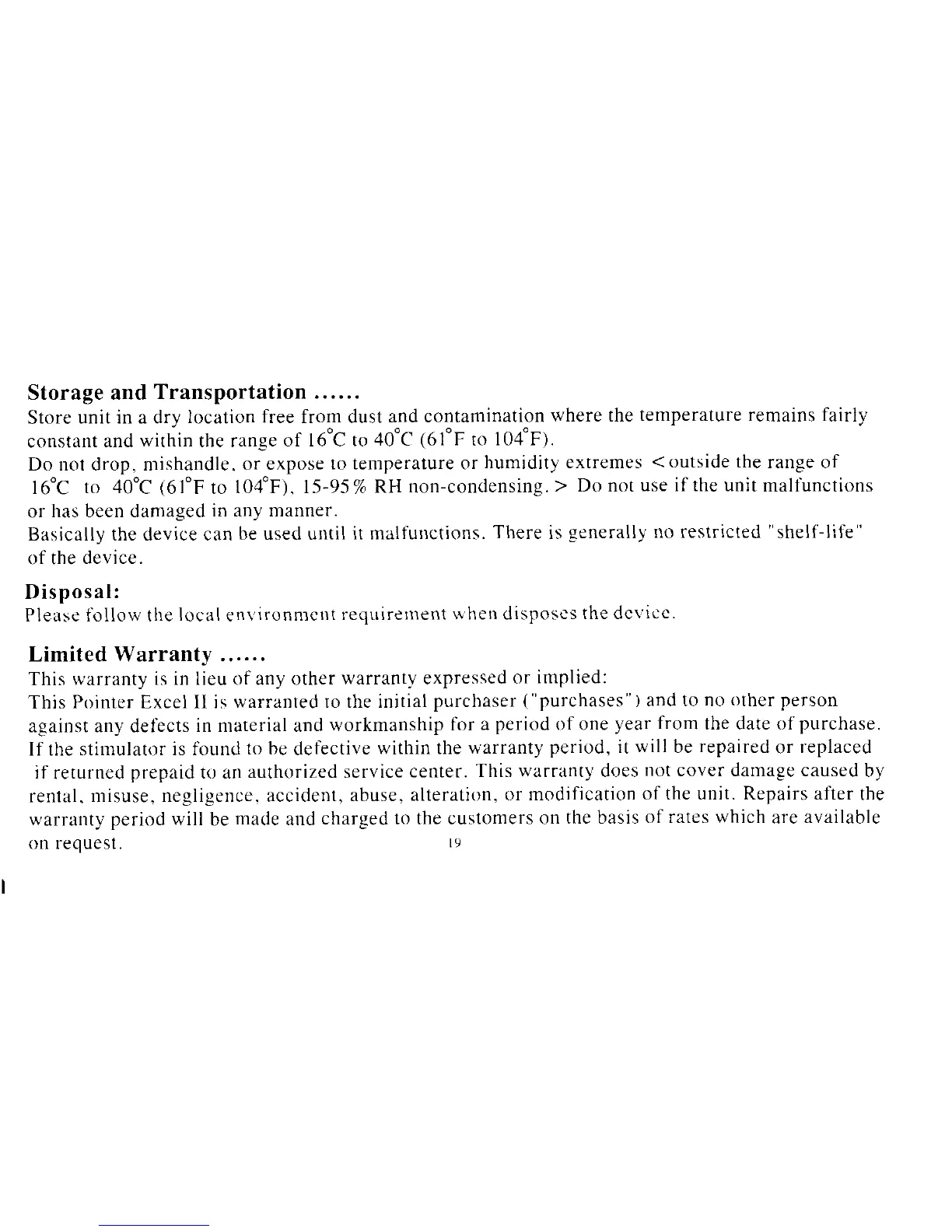 Blue Moon Health Source POINTER EXCEL II - Storage and Transportation; Limited Warranty Information