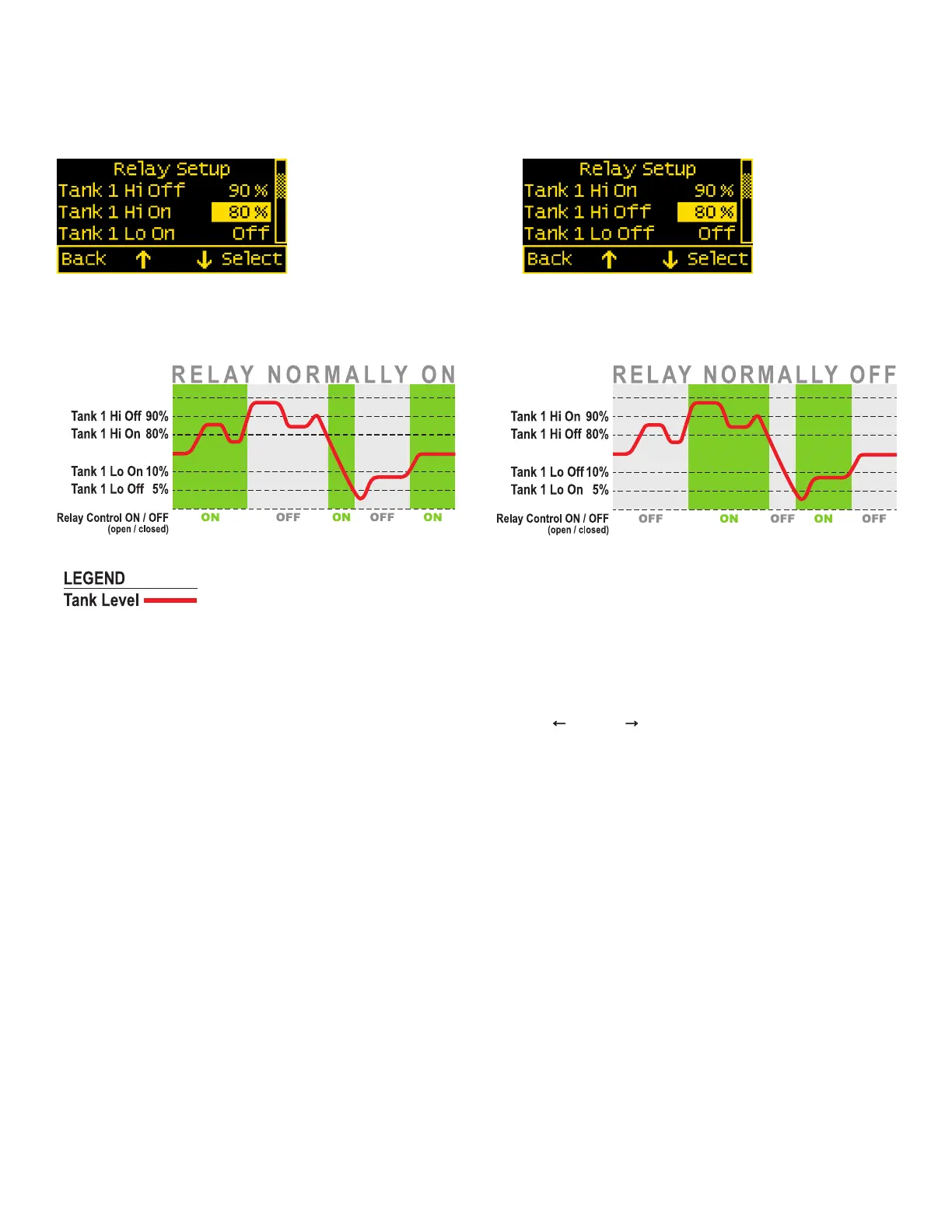 Example. If the relay is Normally On (closed) and Tank 1 is congured as above, then it will open at the user input threshold value for Tank 1 (90%).