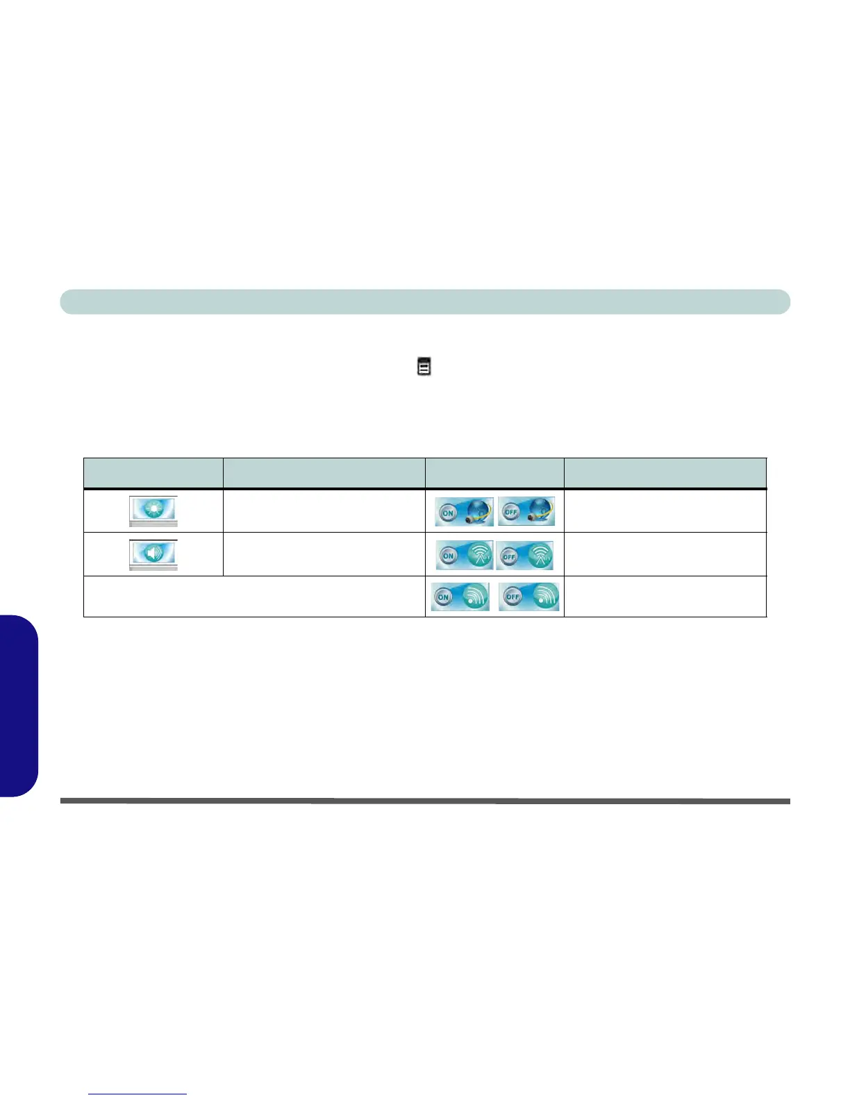 WLAN and Bluetooth power indicators will only display if the modules are included in your purchase configu-