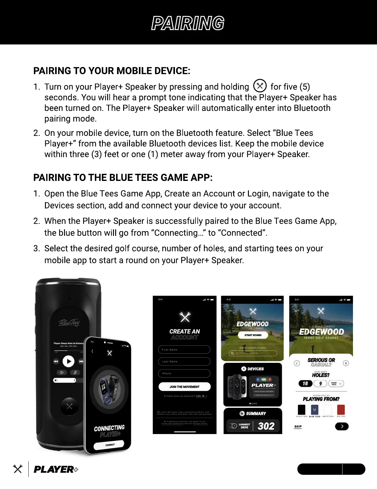 Blue Tees Golf PLAYER+ - Pairing; Pairing to Your Mobile Device; Pairing to the Blue Tees Game App