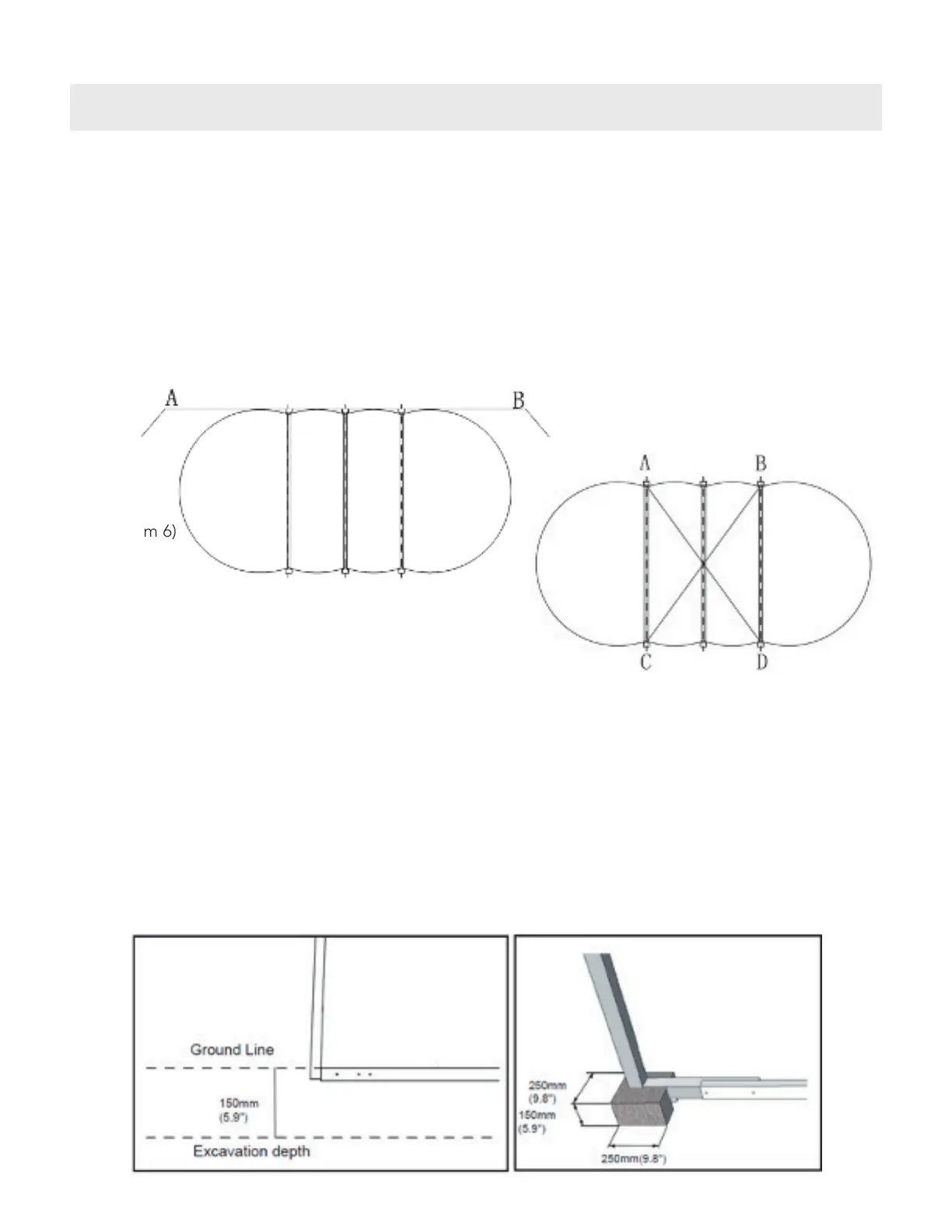 • The marked areas should be excavated to a depth of 5.9-in x 5.9-in (150-mm x 150-mm) wide across