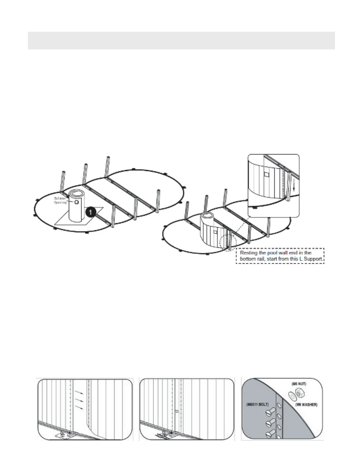 • CAUTION: Have 2 or 3 additional people for the installation of the pool wall into the bottom rail.