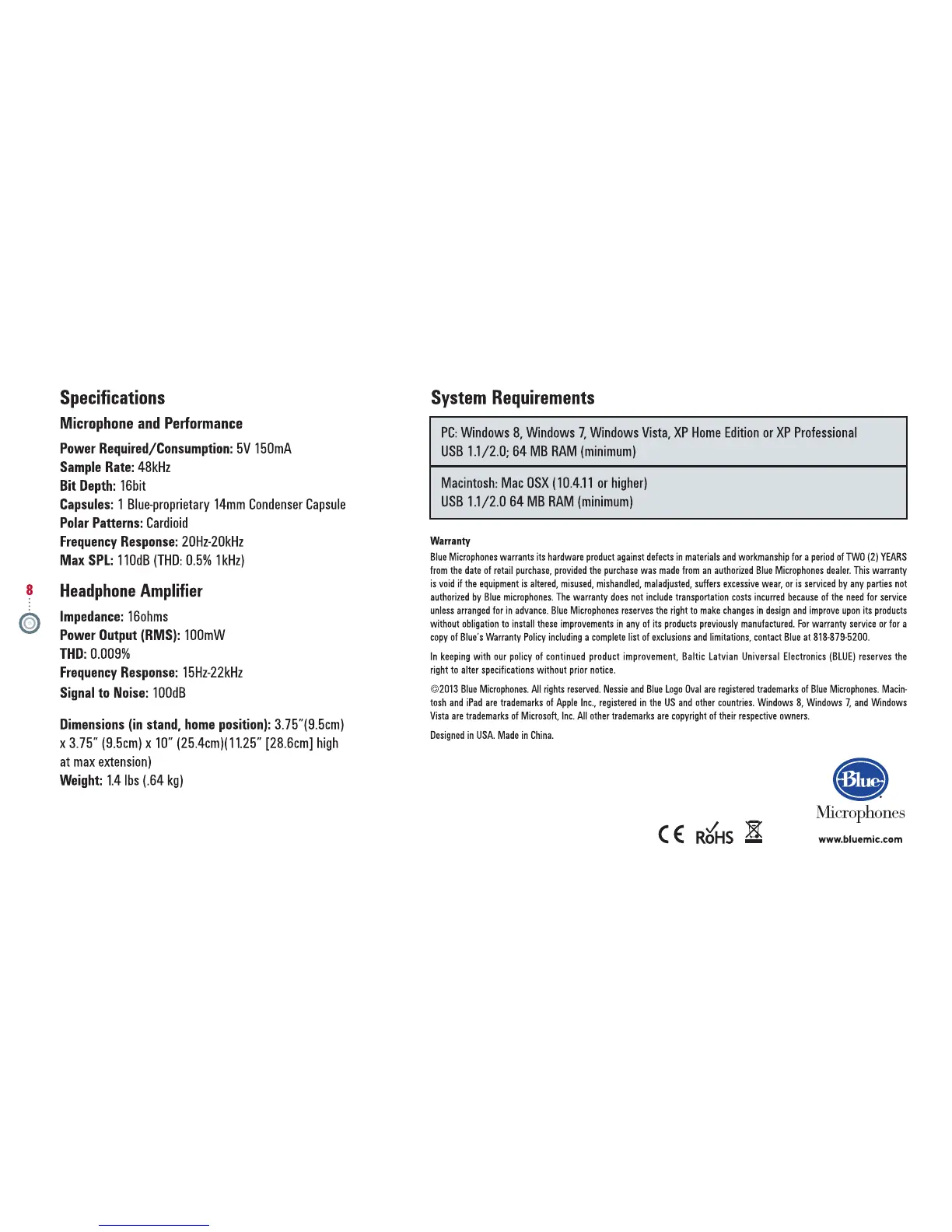 Blue Nessie - Technical Specifications; Microphone Performance Specs; System Requirements; PC System Requirements