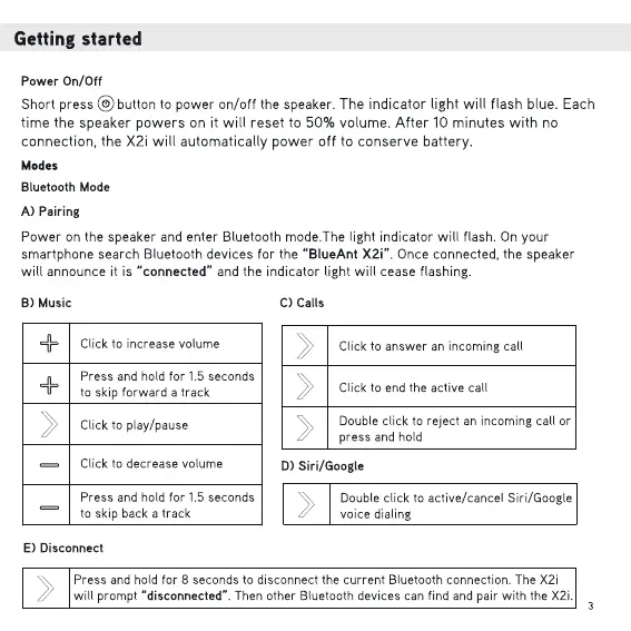 Press and hold for 8 seconds to disconnect the current Bluetooth connection. The X2i