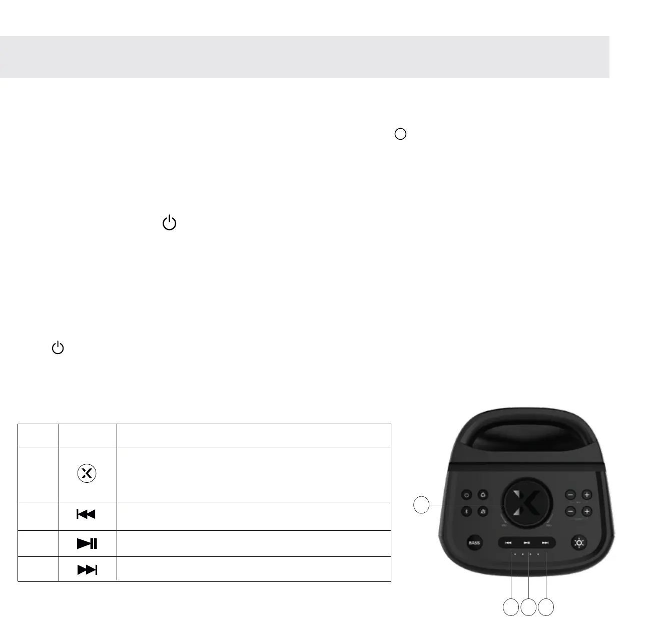 Press button to power on/off the speaker (1.5 seconds). Each time the speaker powers on, it will reset to 25% volume.