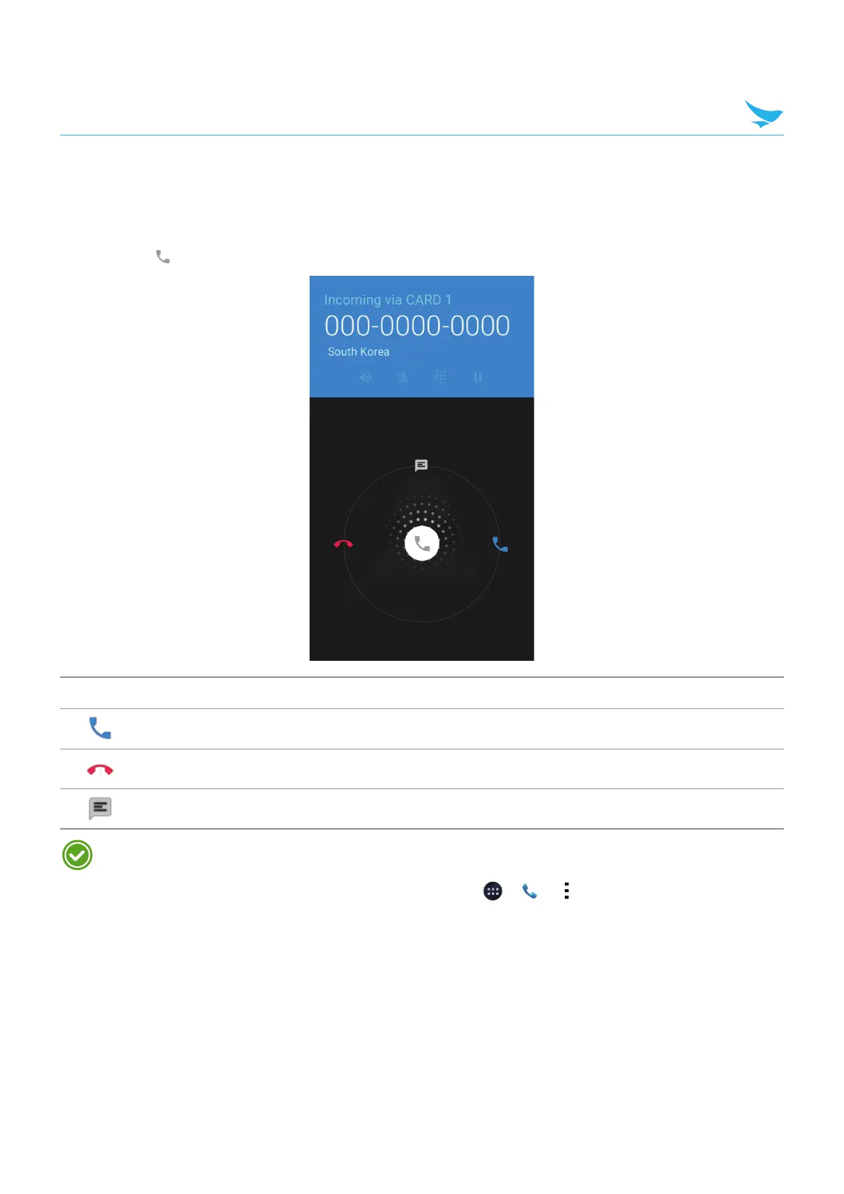 When you receive a phone call, the incoming call screen opens with the caller ID, and any other available
