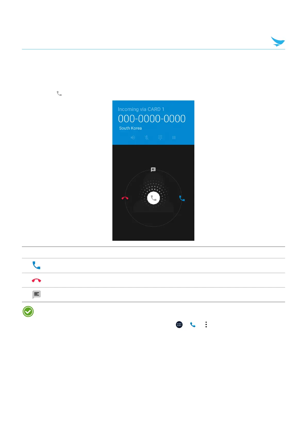 When you receive a phone call, the incoming call screen opens with the caller ID, and any other available