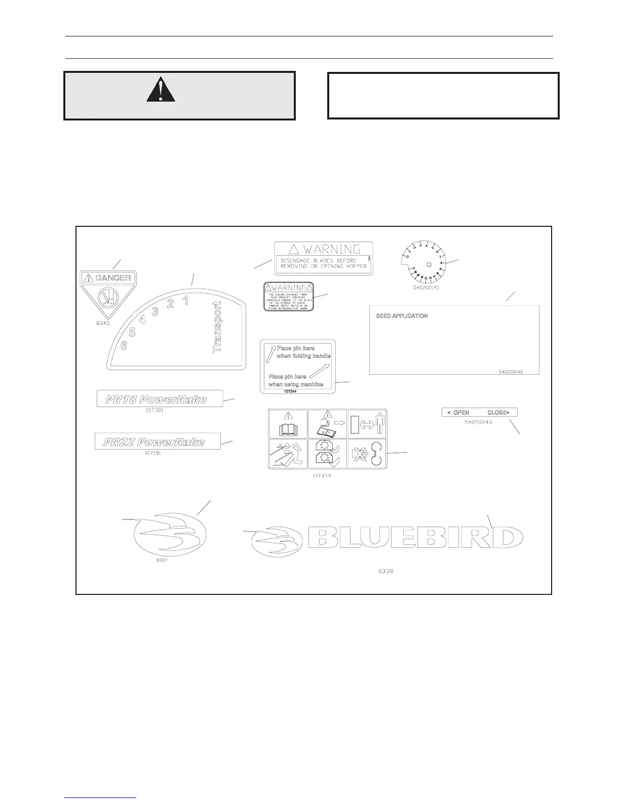 Bluebird S22H5DA - Symbols and Decals; WARNING!; IMPORTANT INFORMATION; Decals and machine-bound instructions