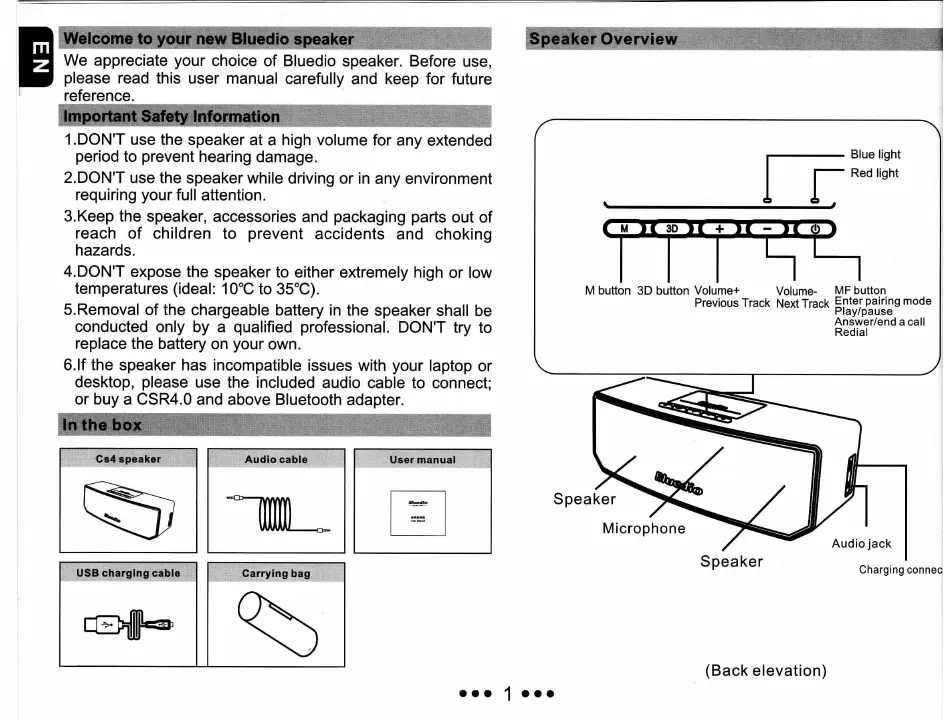 Bluedio CS4 - Important Safety Information; Speaker Overview
