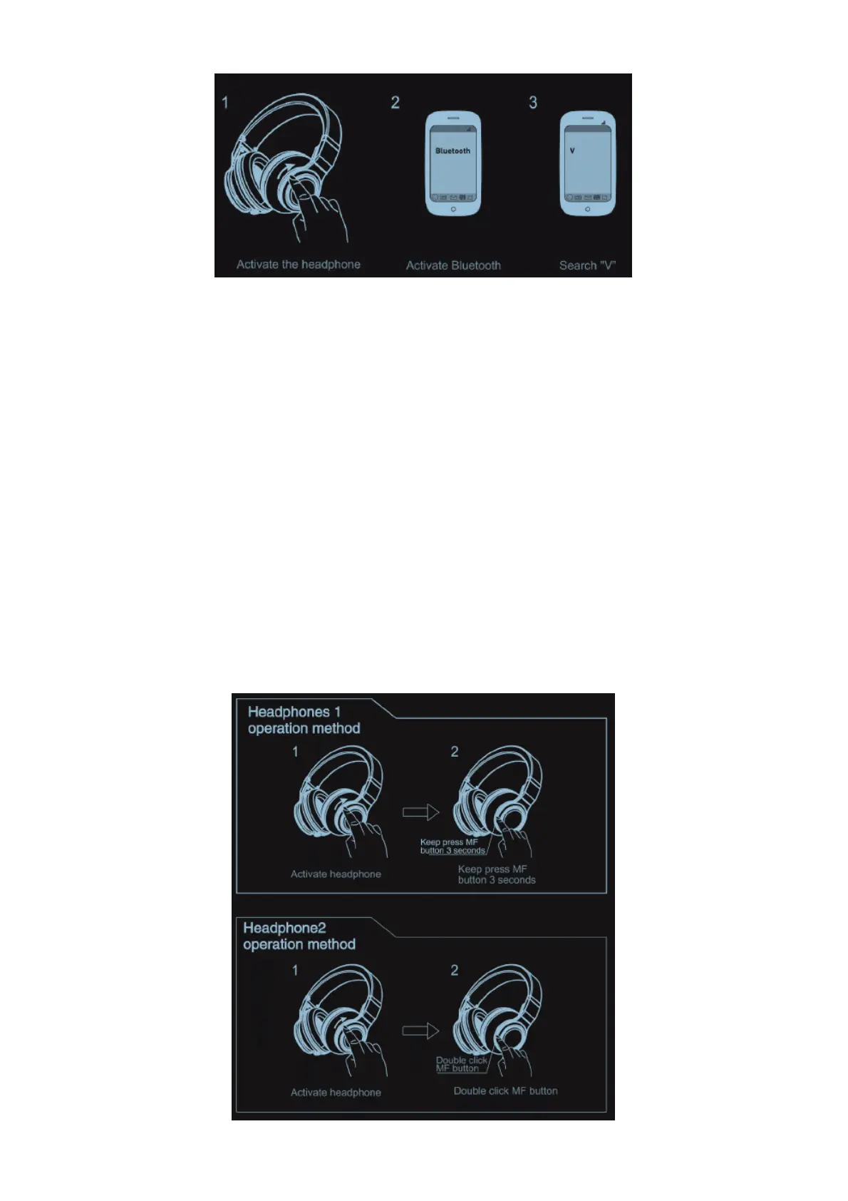 3. Keep press MF button of headphone 1 for around 3 seconds, release until hear the beep sound,