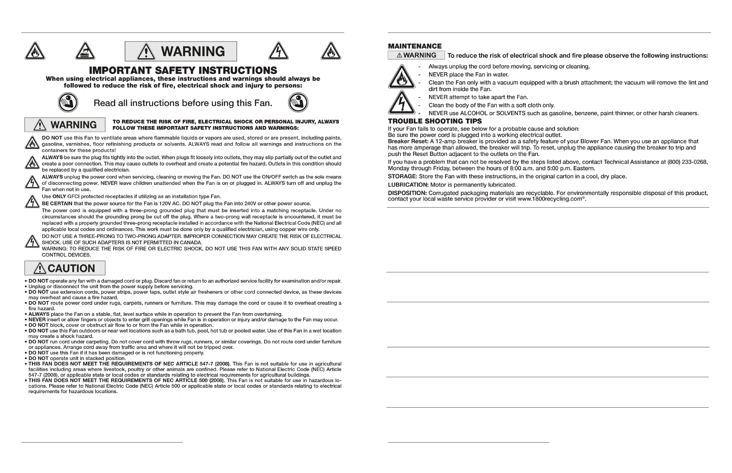 powered devices. The sum total amperage of all devices (excluding the first fan) plugged into the receptacle must not exceed 8.7 amps.