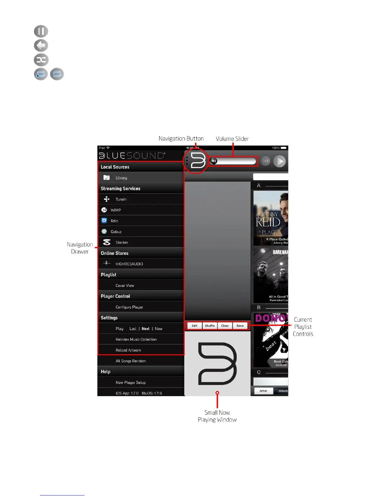 The following explains the function of each item in the Bluesound Navigation Drawer.