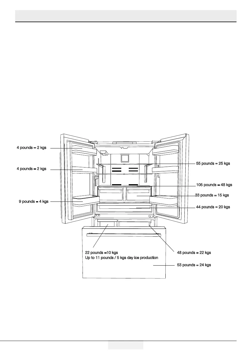 depósito de hielo tiene capacidad para 24 kg (53 libras) y el cajón tiene capacidad para 30 kg (66