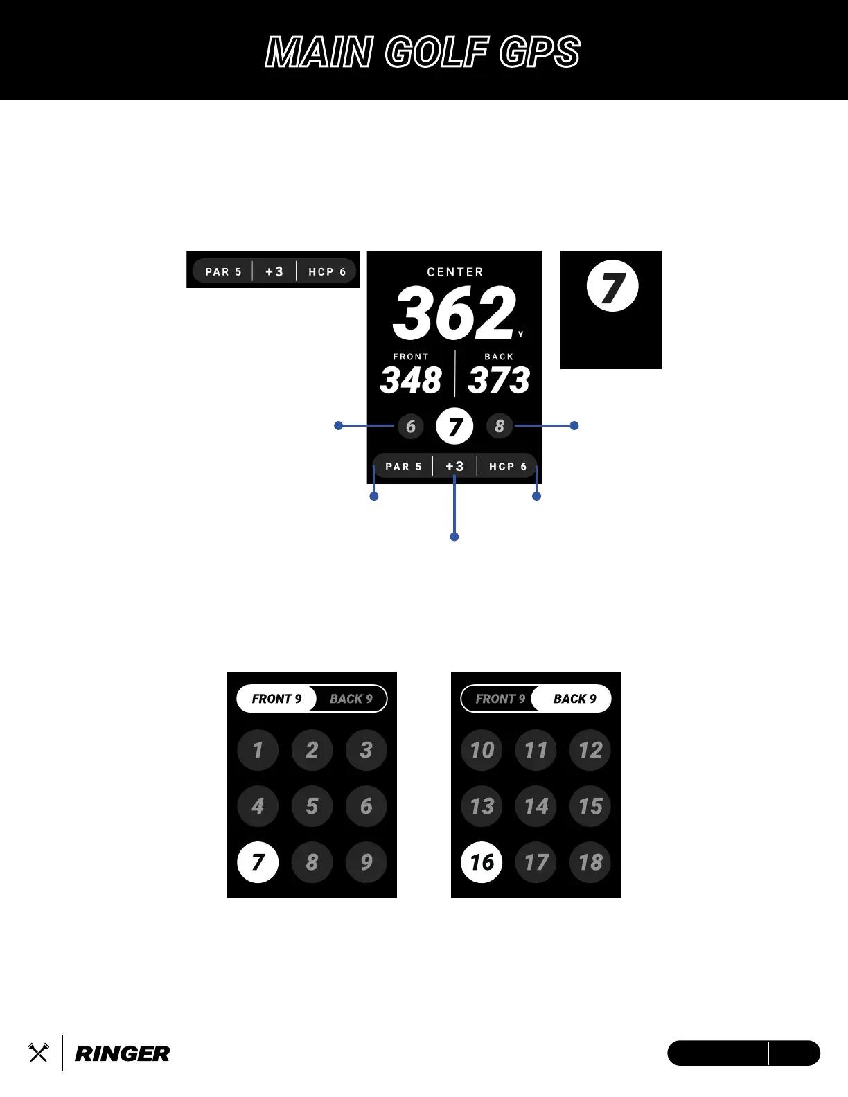 BlueTees Ringer - MAIN GOLF GPS VIEW; Hole Navigation; Hole Menu Access; Score Menu Access