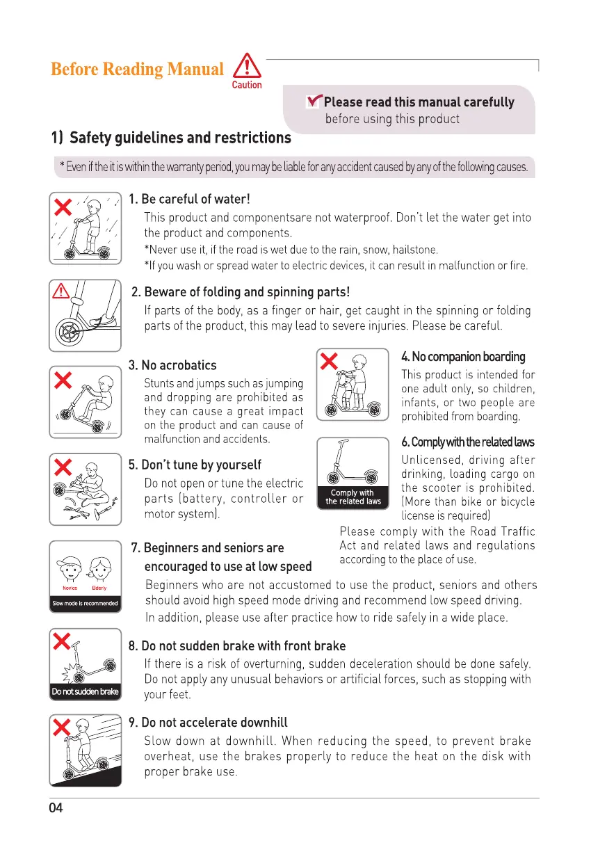 BLUETRAN LGMJ1 - Safety Guidelines and Restrictions; Handling Water and Moving Parts; Prohibited Actions and Legal Compliance