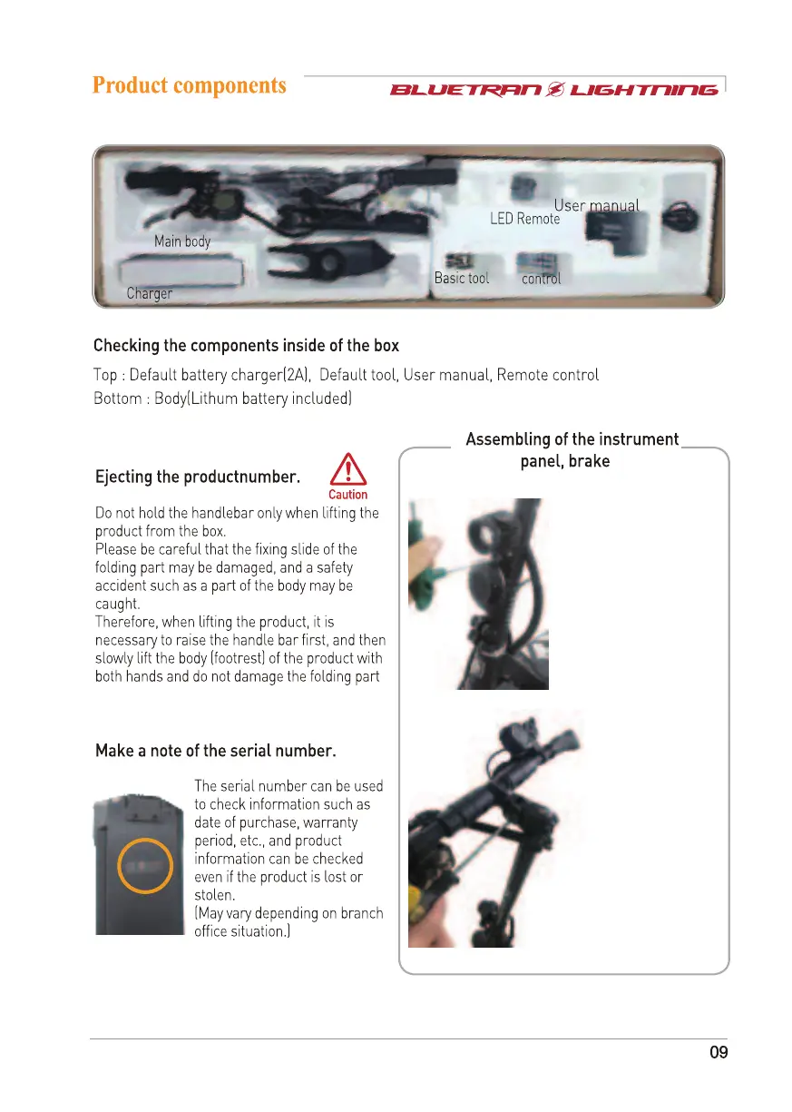 BLUETRAN LGMJ1 - Product Components; Box Contents and Initial Setup; Assembling Handlebar and Brake