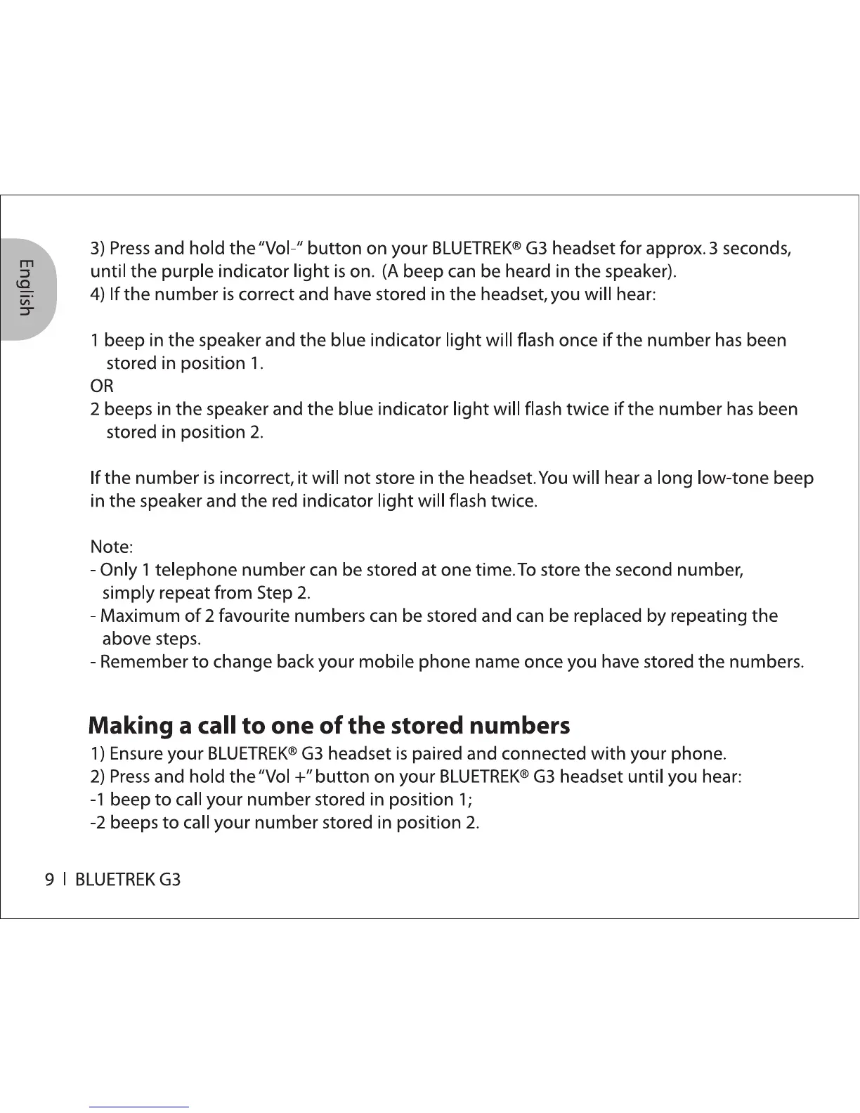 BlueTrek G3 - Making a call to one of the stored numbers; Dialing Stored Numbers