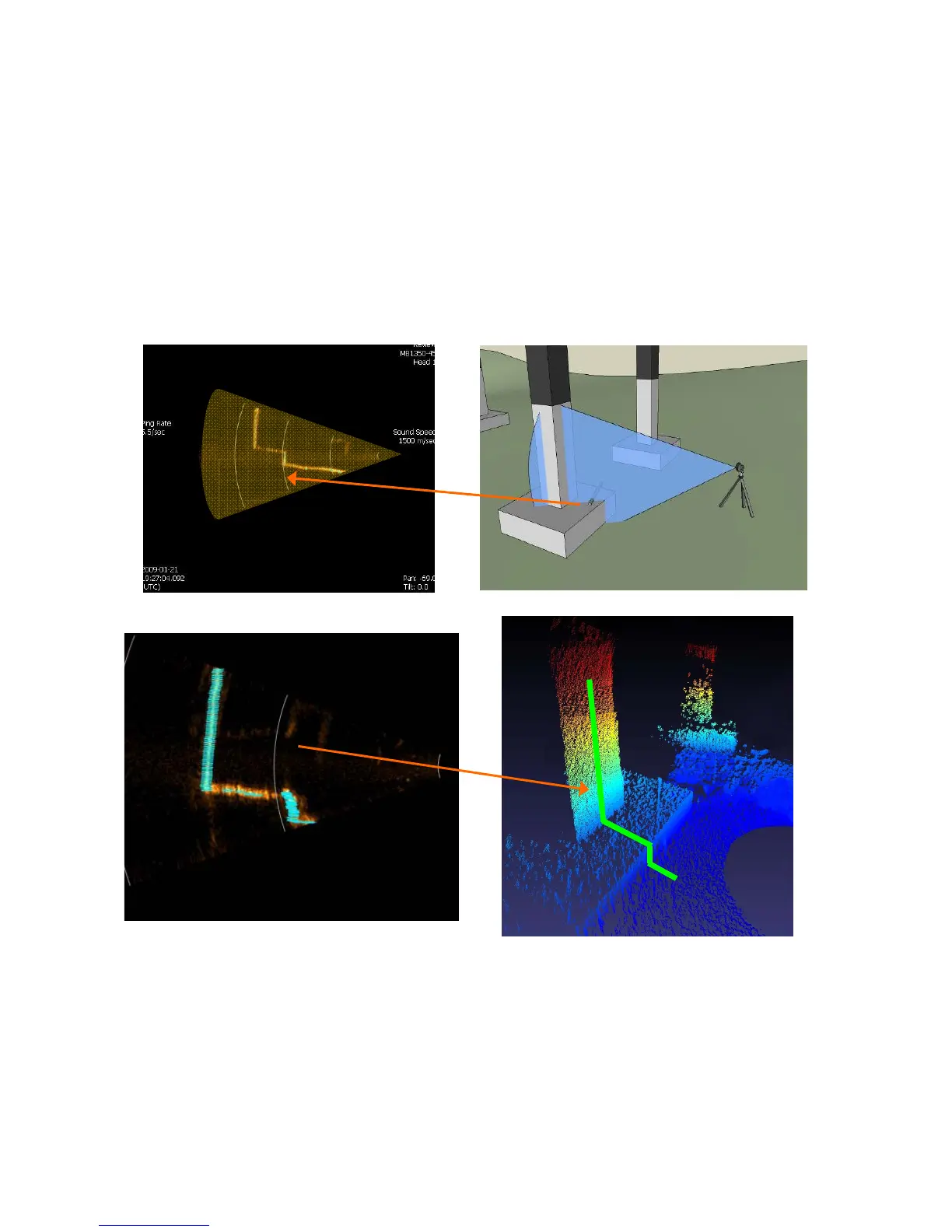 Clockwise from upper left: Illustration of the multibeam collection, display of