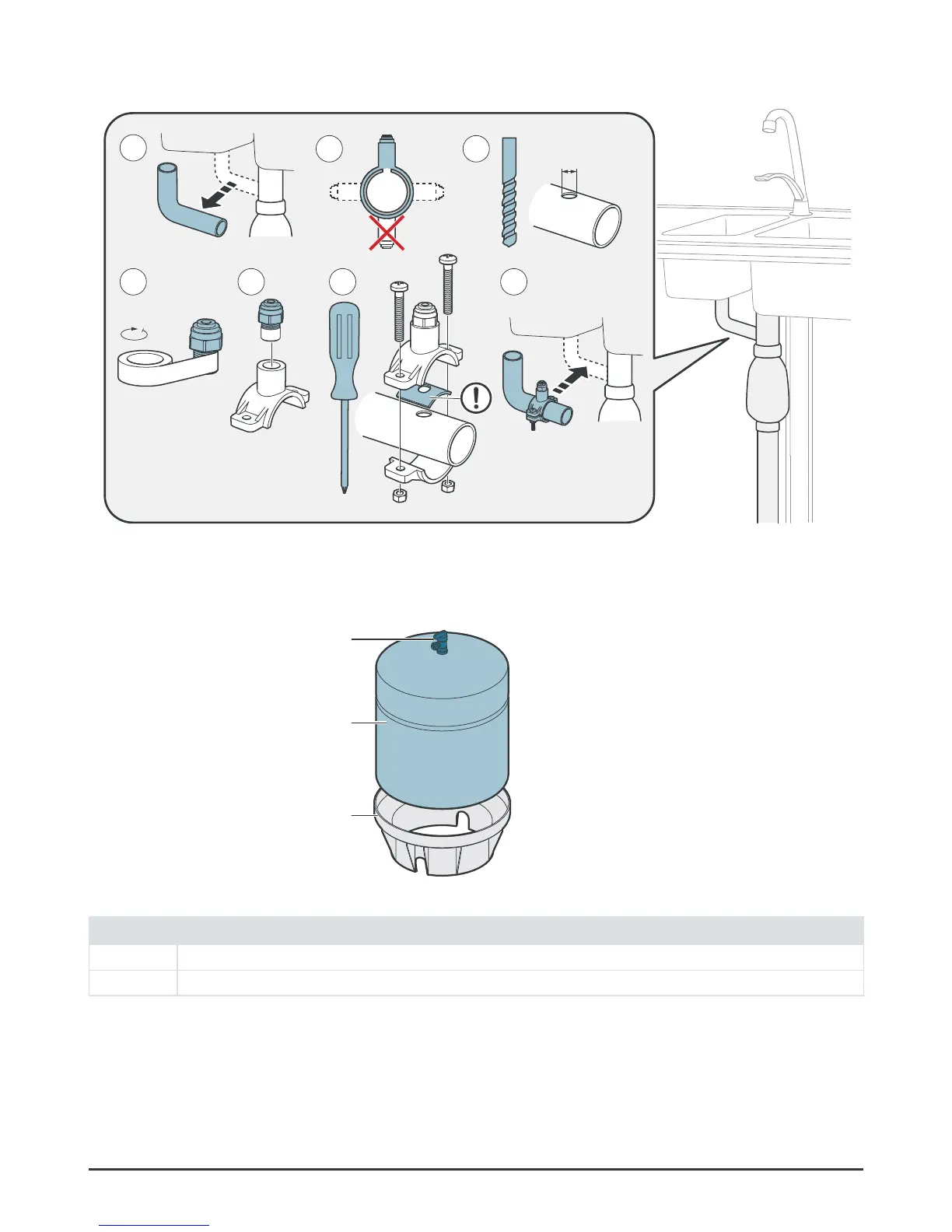 2 Put the tank (2) under the kitchen sink. (Use the stand (3) if it is included.)
