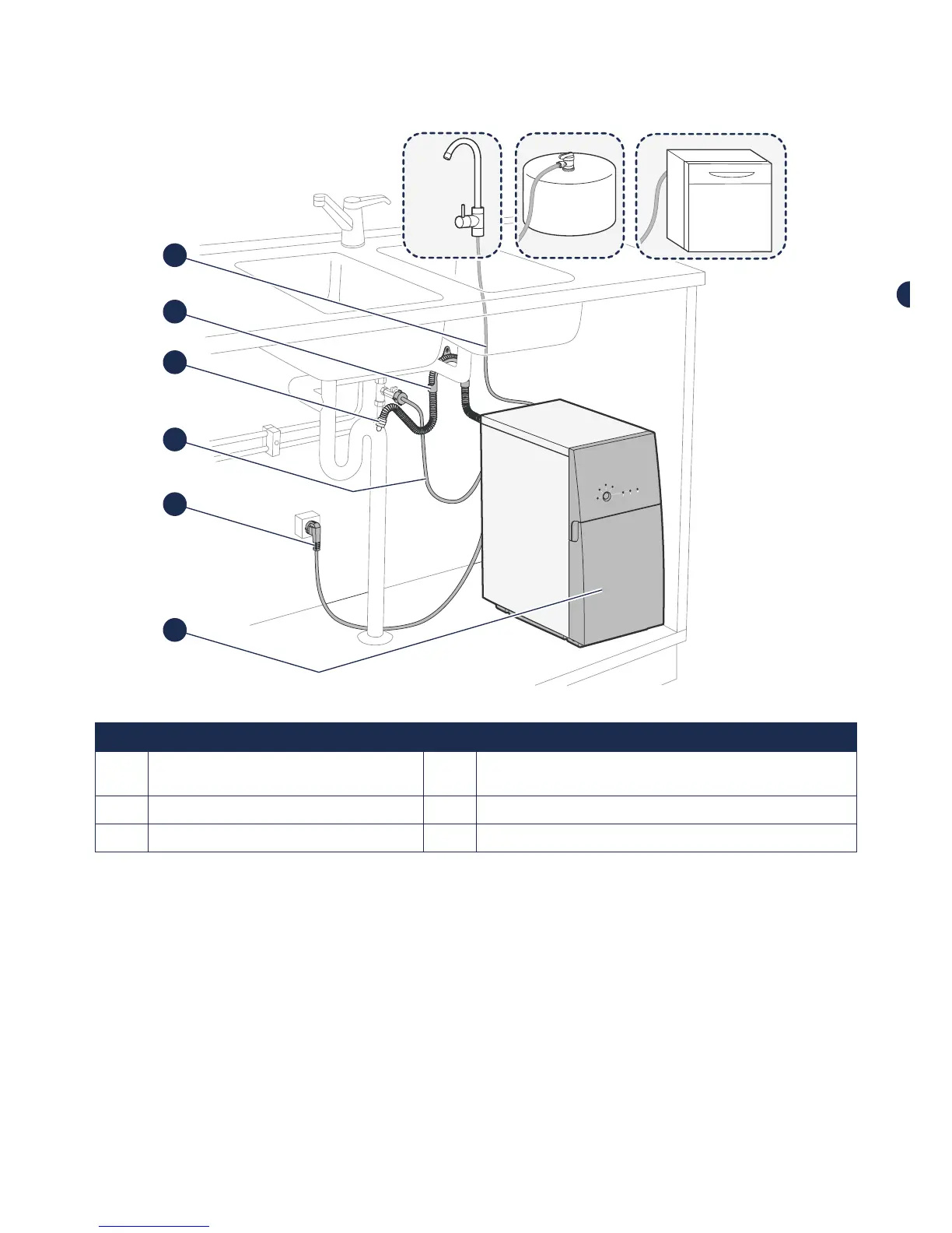 1 Purificador de água 4 Mangueira de drenagem de água, instalada com
