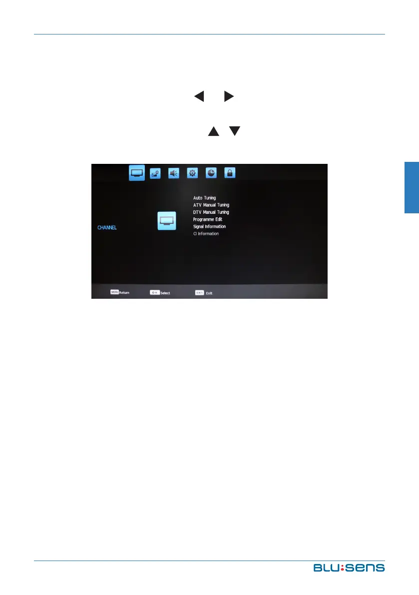 Turn on the TV by pressing the red POWER button, press MENU to display