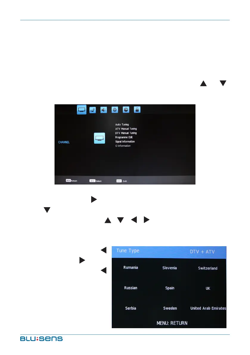 Auto Tuning: Press / key to select tune type (ATV, DTV or DTV+ATV).