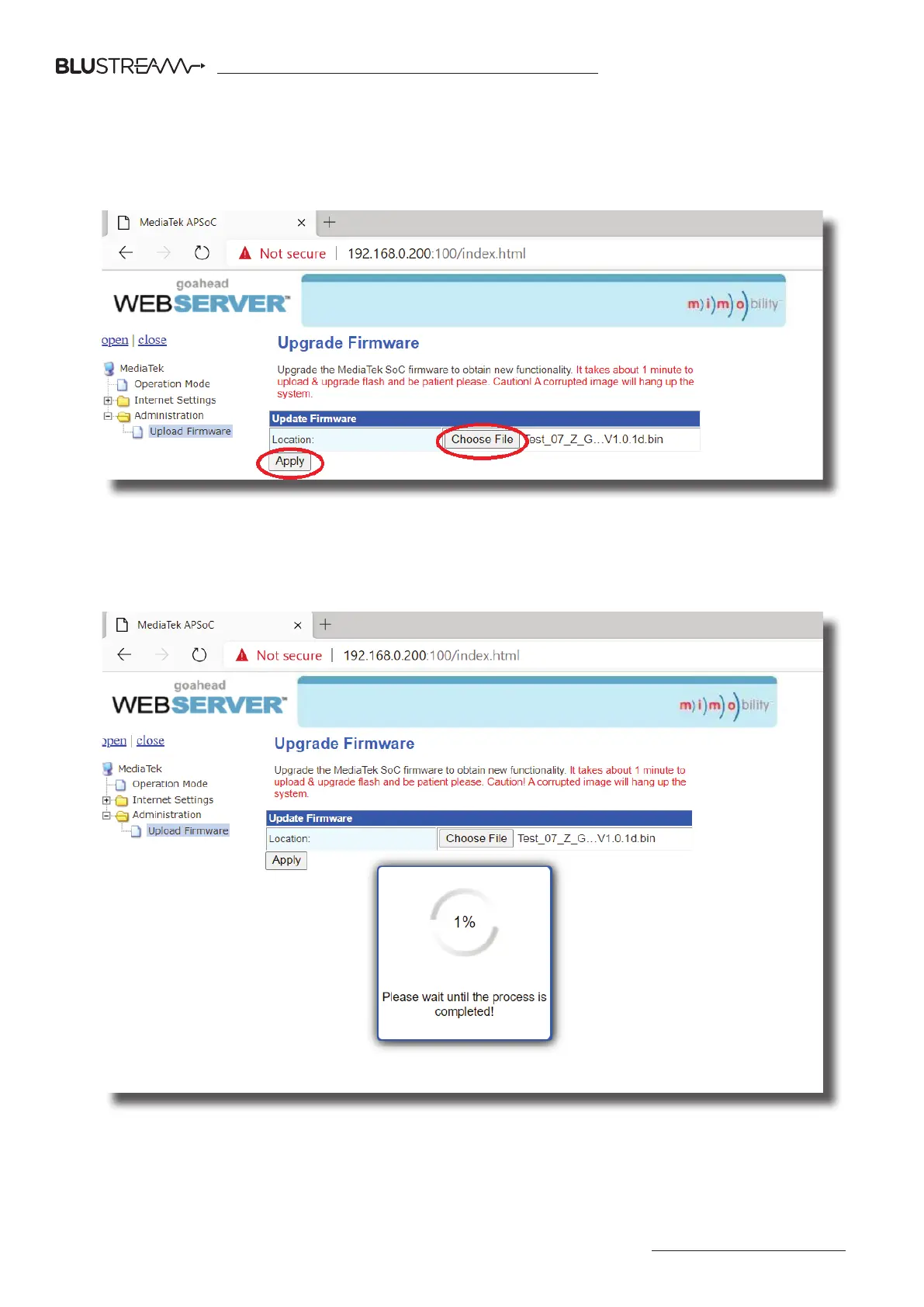 4) Click 'Choose File' and select the web-GUI (MediaTek) firmware file downloaded from the Blustream website. This