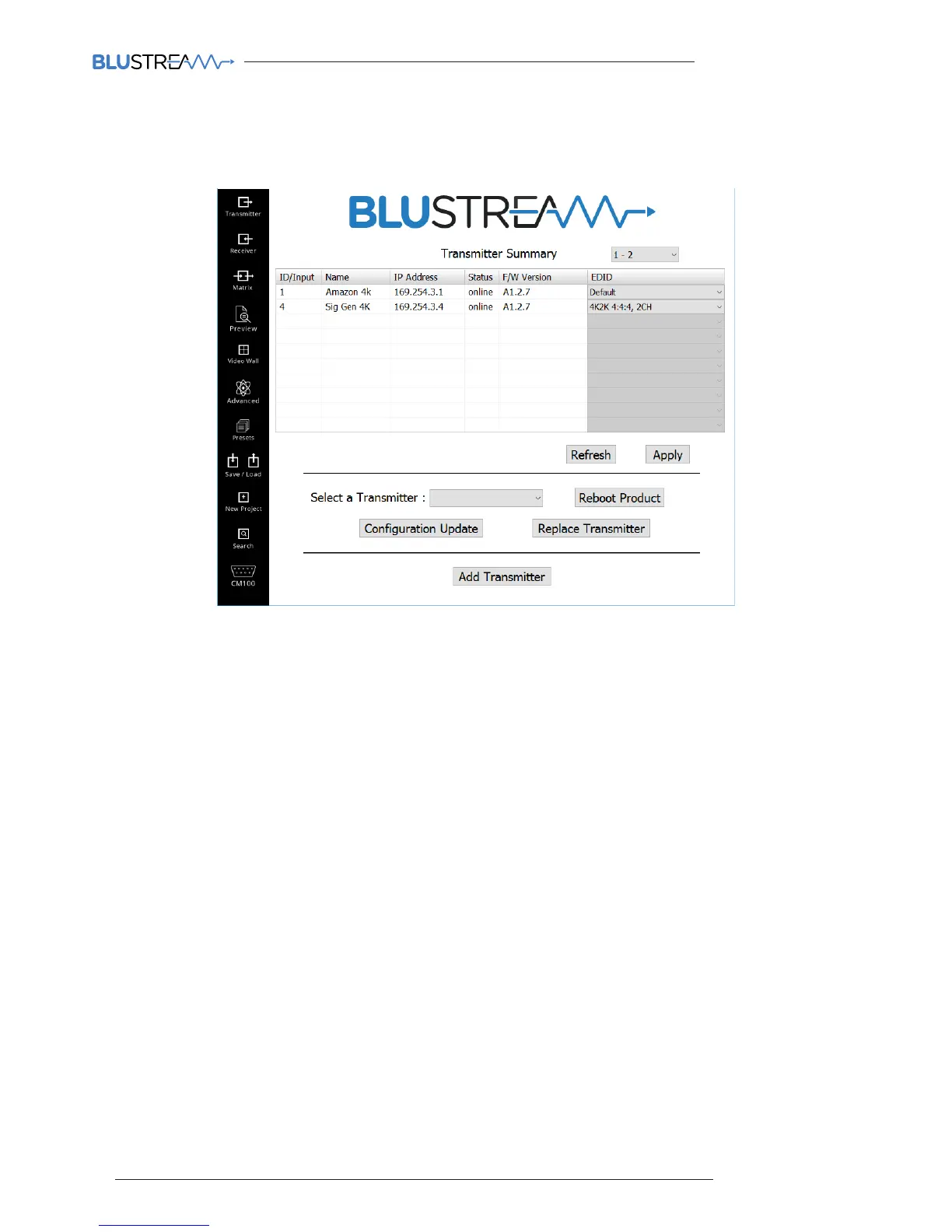 The Blustream Multicast Transmitter summary window gives an overview of all of the Transmitter products that have
