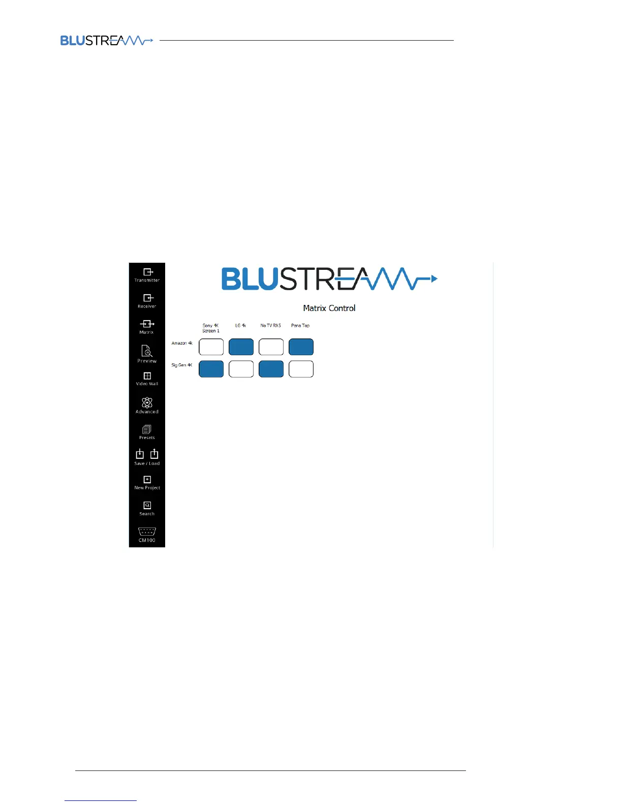 The Blustream PC soware Matrix control page is used to quickly and simply change source inputs (Transmitters) for