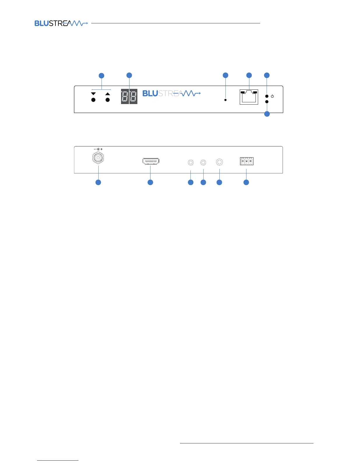 9 IR RX (IR input) – 3.5mm stereo jack. Transmits IR to any IP100UHD-RX receiver currently viewing the IP100UHD-TX.