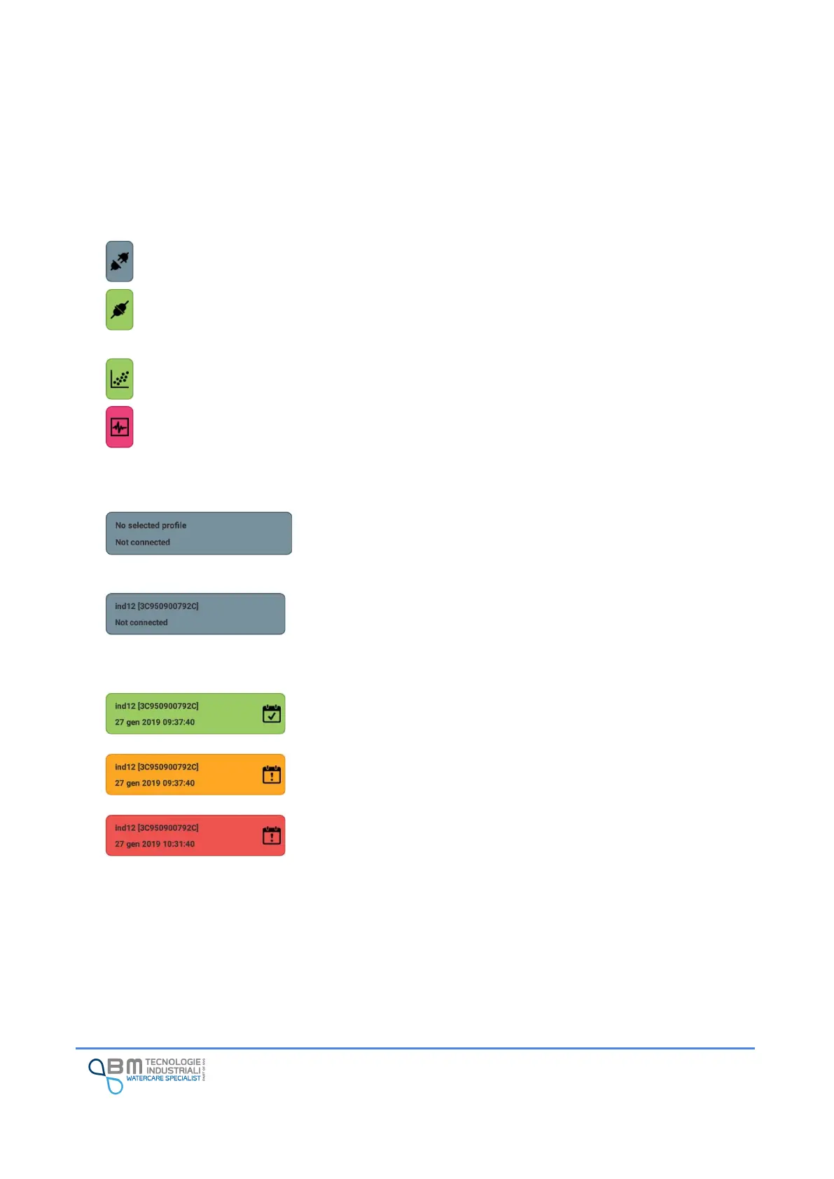 The block on the right indicates the connection status with the instrument and allows the user to start the