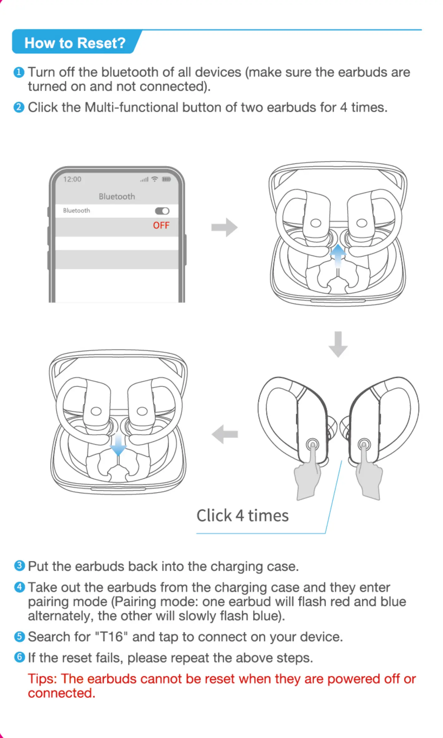 Tips: The earbuds cannot be reset when they are powered off or