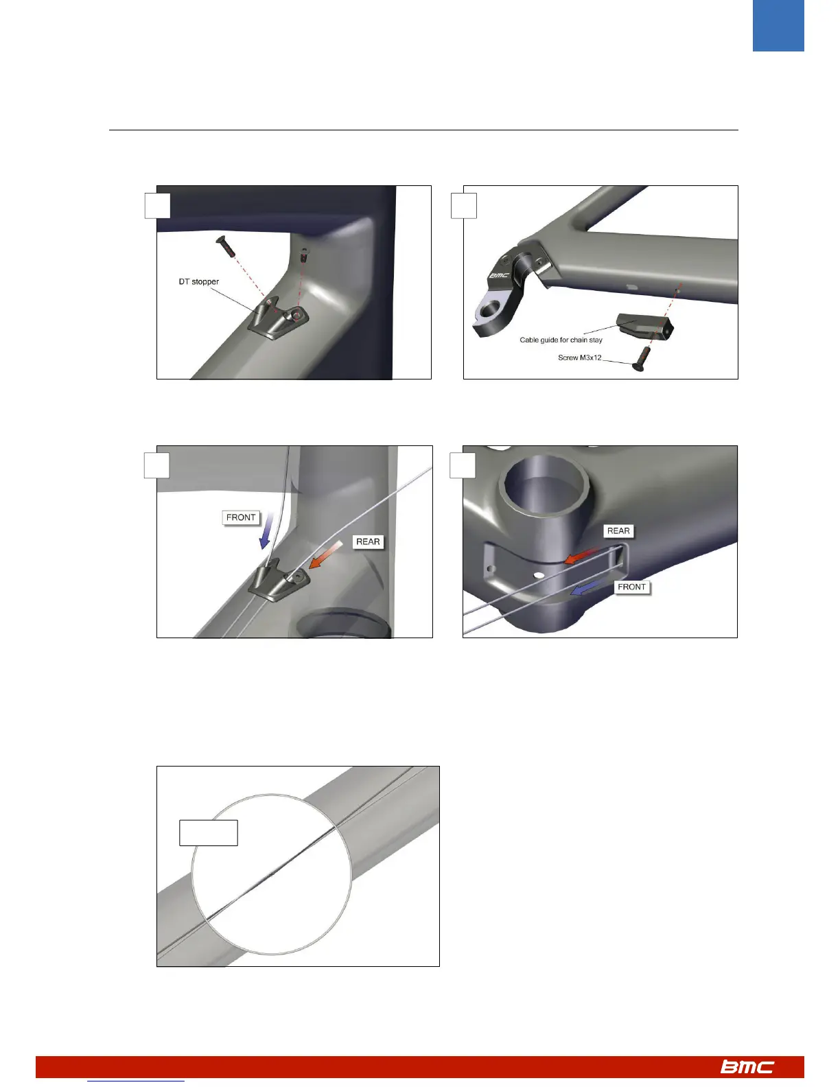 2. Insérer le câble de dérailleur arrière (REAR) à travers la butée du tube diagonal (3) et sortir à travers le trou oblong situé près du