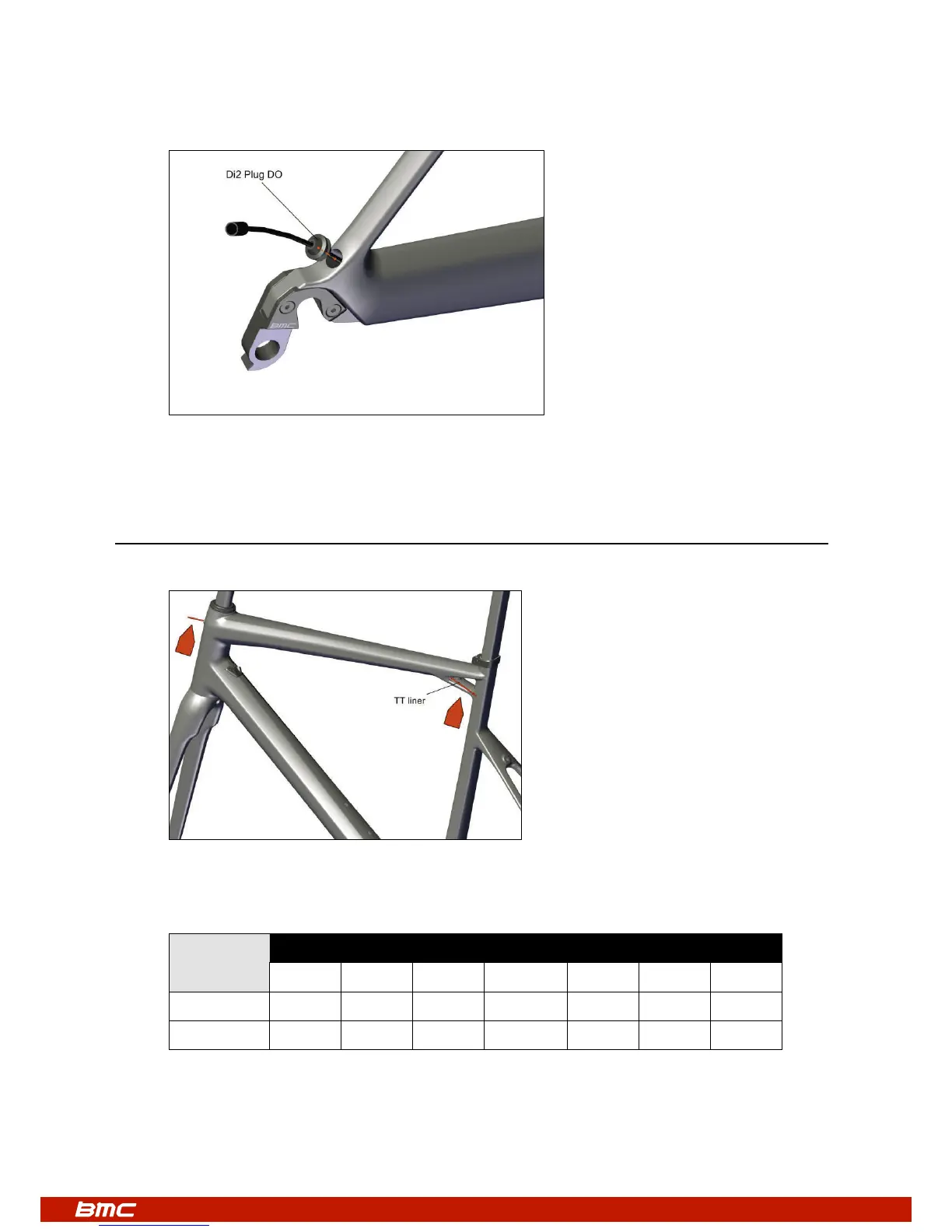 2. Reportez-vous au tableau ci-dessous dans le but de pré-définir la longueur à couper pour la gaine de frein arrière.