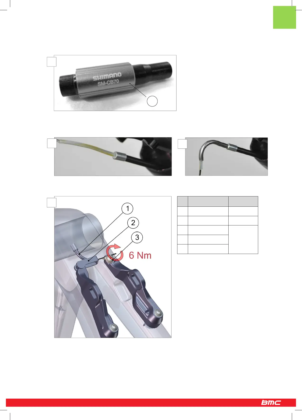 11. Install the pipe holder (N°2) and clamp the brake cable on the left brake arm with the T25 anchor bolt (N°3). Tighten to 6 Nm.