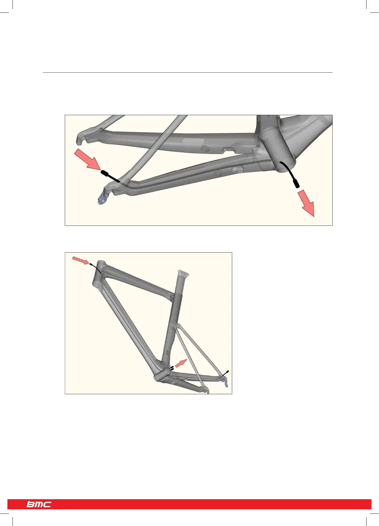 Entrer par l’ouverture de la douille de direction et sortir par le boitier de pédalier côté droit.