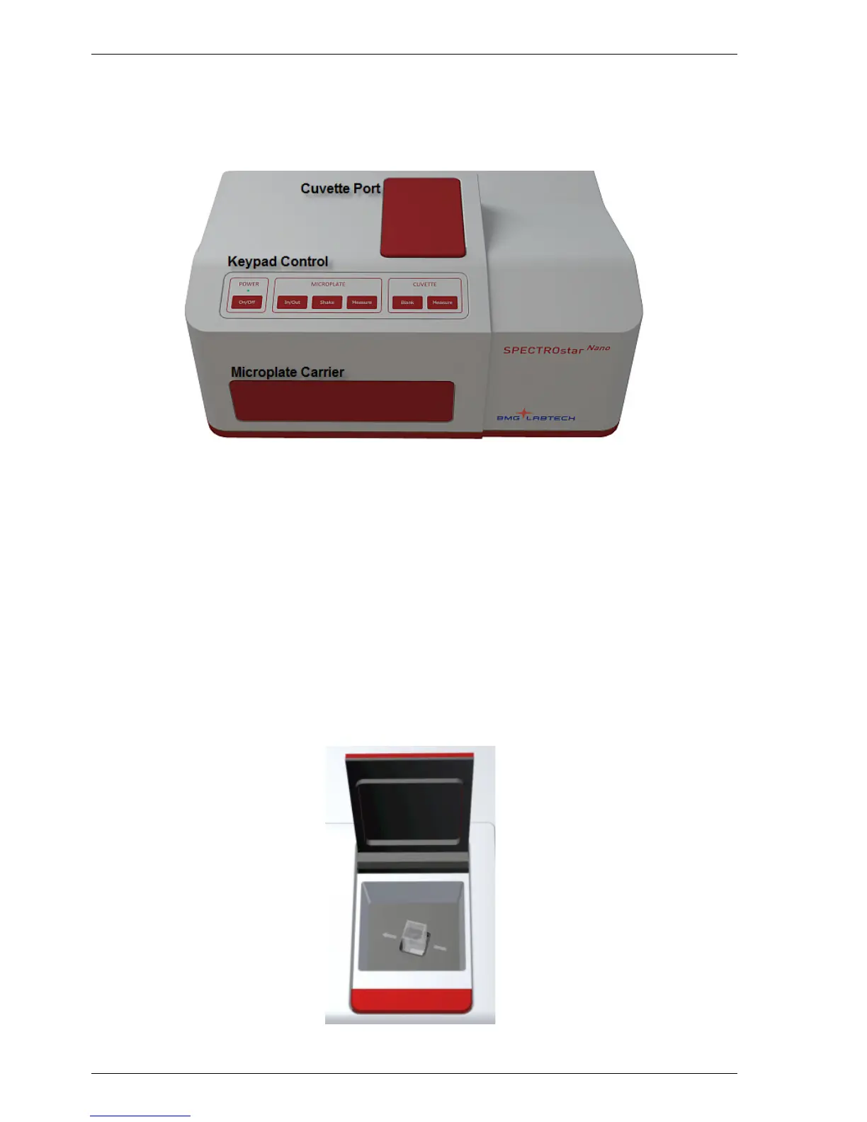 The front of the SPECTROstar Nano is divided into three sections: the Microplate Carrier, the Cuvette Port,