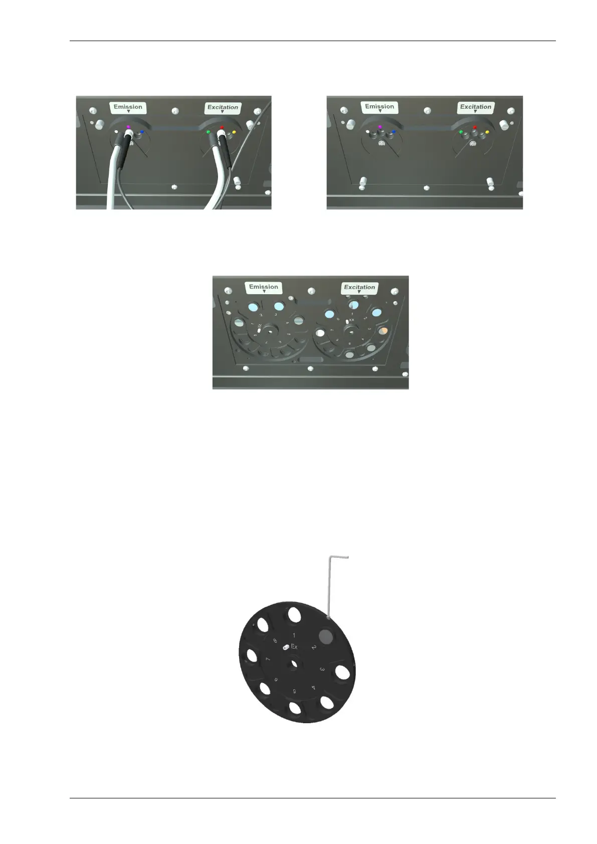 The excitation filters and the emission filters are located in their respective filter wheels behind the filter
